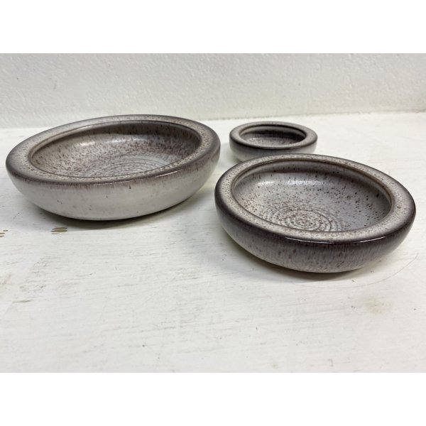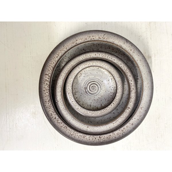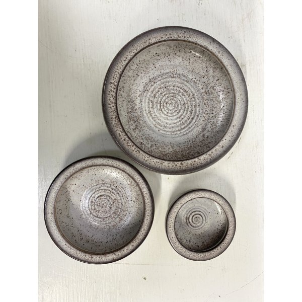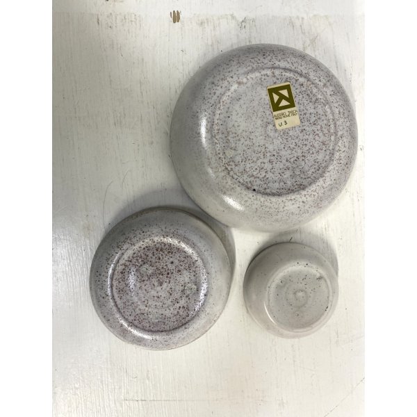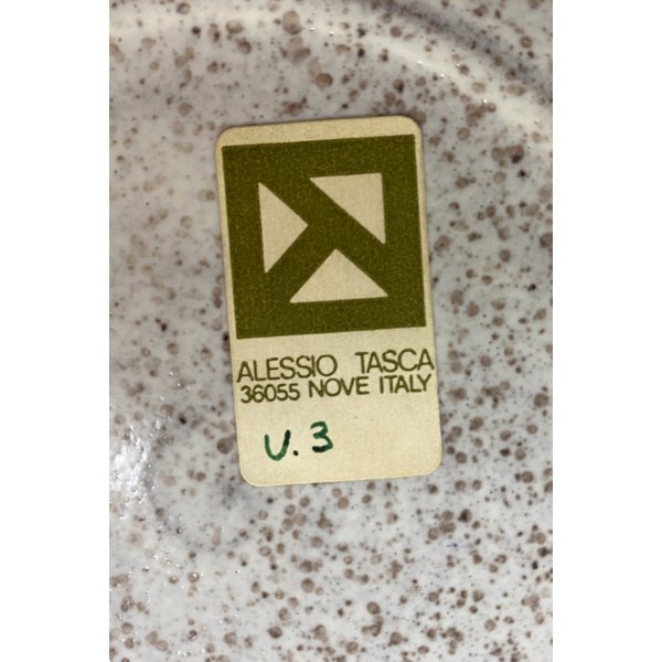 Stupendo set composto da 3 ciotole/bowl, contenute una nell'altra, disegnato da Alessio Tasca (1929-2020), realizzato in ceramica, gres smaltato color calcare con delicata punteggiatura in toni bruni. Design industriale caratterizzato da un motivo a linee, ispirato al minimalismo giapponese. Set prodotto dalla manifattura "Nove" di Bassano negli anni '70, sulla base etichetta con marchio e Mod. "U3" scritto con pennarello verde. In ottime condizioni conservative, visibili dalle fotografie allegate all'inserzione.