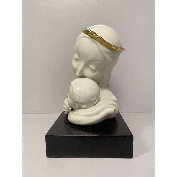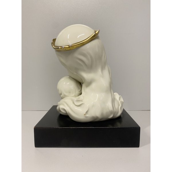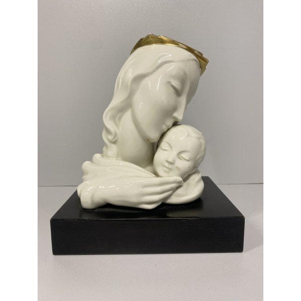 Stupenda scultura in porcellana bianca a tuttotondo, raffigurante la Madonna con corna lumeggiata i oro zecchino. Lo stile dell'opera è essenziale, moderno, celebra la Maternità, la Vergine Maria tiene teneramente tra le braccia il Gesù Bambino, i loro volti sono inclinati l'uno verso l'altra. La scultura è stata incollata ad un basamento in legno ebanizzato, che impedisce la vista della base. Dalla ricerca effettuata nel nostro studio, l'opera è riferibile a: Rosenthal - Madonna, Madre di Dio e Bambino, Fucik Fischmeister 1936, n. 840