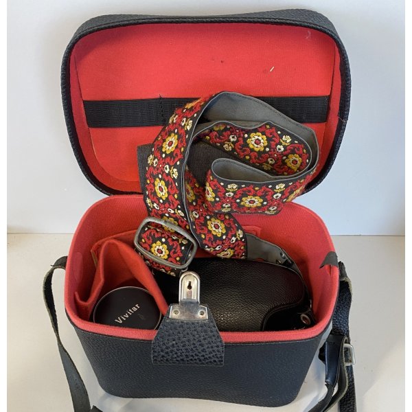 Stupenda macchina fotografica vintage, fotocamera reflex FUJICA AX-3 analogica 35mm prodotta da Fuji negli anni '80, in buone condizioni, inserendo la batteria scatta, non testata con la pellicola, i movimenti delle ghiere sono fluidi, completa di obiettivo X Fujinon 50mm f/1:1,9 e Teleobiettivo Auto Vivitar Telephoto 135mm 1:2.8. Tutto contenuto in una borsa coordinata alla custodia della macchina fotografica e tracolla personalizzata dai colori vivaci giallo rosso su fondo nero con pattern vintage. la borsa presenta segni del tempo usura, scuciture e scollature, la fibbia funziona. Le condizioni sono visibili dalle fotografie allegate all'inserzione