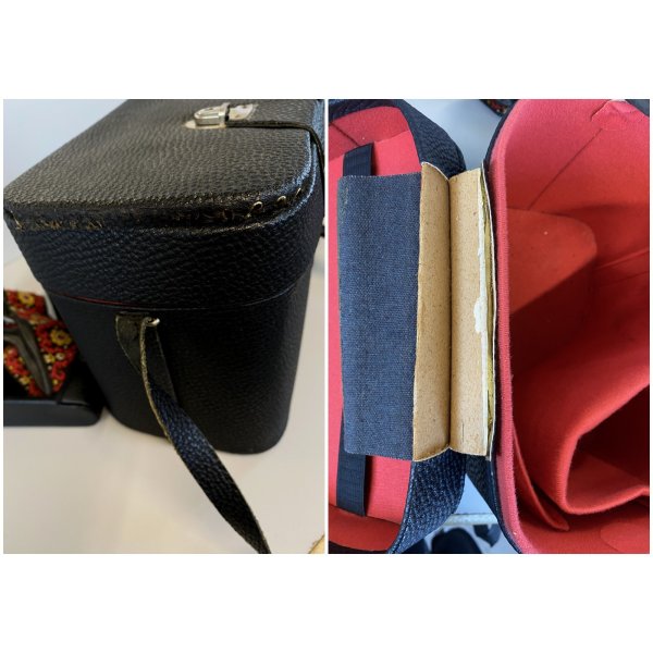 Materiali: Metallo, alluminio, pelle, similpelle, ottica custodia in pelle con interno in velluto, borsa in pelle nera con interno rorasso, tracolla tessuto ricamato.