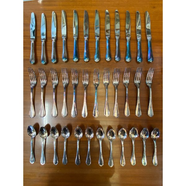 Dimensioni: Composto da . 12 Coltelli 24,6 cm - 12 Cucchiai 20,6 cm - 12 Forchette 20,7cm - 12 forchette 17,8 cm - 12 Coltellini da pesce 19,8 cm - 12 forchettine da pesce 15,9 cm - 12 Cucchiaini da dolce 13,5 cm - 12 Forchettine da dolce 17 cm - Posate a servire per pesce: Coltello 27,8 cm - Forchetta 21,8 cm - Posate a servire Cucchiaio 24,2 cm e forchetta 25,5 cm grandi - Mestolo a servire 32 cm - Posate a servire carni: Forchettone 27,3 cm - Coltello 32,7 cm - Paletta dolce 25,7 cm - Coltello burro 18,6 cm - Per un totale diPer un totale di 105 pezzi. Tutto visibile dalle fotografie allegate.