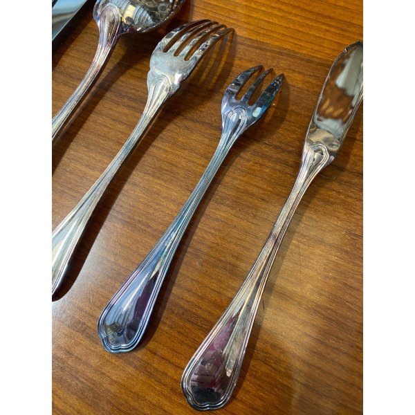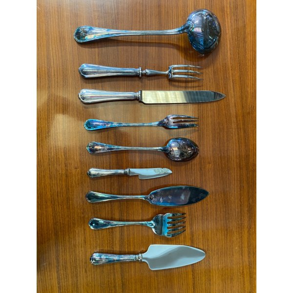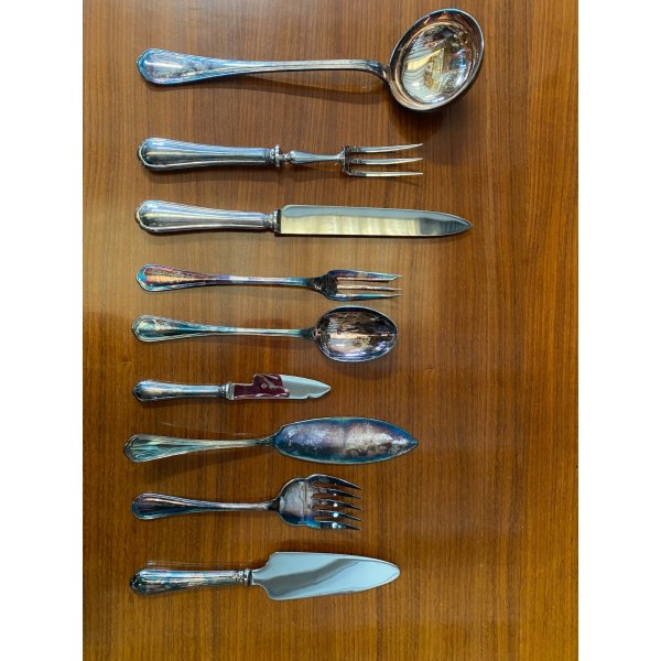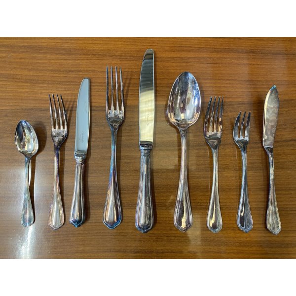 Elegante servizio di posate argentate della prestigiosa linea Christofle modello "Spatours" per 12 persone (9 posate per coperto) 105 pz. Prodotto nella metà del '900. Composto da: 12 Coltelli 24,6 cm - 12 Cucchiai 20,6 cm - 12 Forchette 20,7cm - 12 forchette 17,8 cm - 12 Coltellini da pesce 19,8 cm - 12 forchettine da pesce 15,9 cm - 12 Cucchiaini da dolce 13,5 cm - 12 Forchettine da dolce 17 cm - Posate a servire per pesce: Coltello 27,8 cm - Forchetta 21,8 cm - Posate a servire Cucchiaio 24,2 cm e forchetta 25,5 cm grandi - Mestolo a servire 32 cm - Posate a servire carni: Forchettone 27,3 cm - Coltello 32,7 cm - Paletta dolce 25,7 cm - Coltello burro 18,6 cm - Per un totale di 105 pezzi. Servizio in ottime condizioni. Potrai sperimentare un’elegante mise en place, capace incantare i tuoi ospiti con un’atmosfera vintage raffinata.