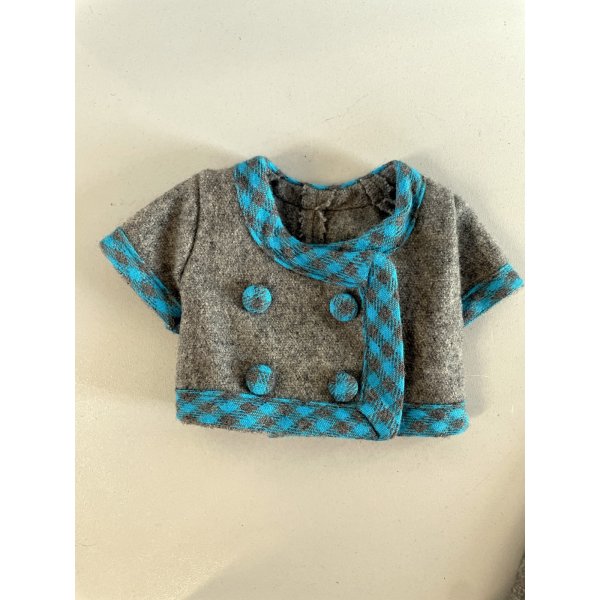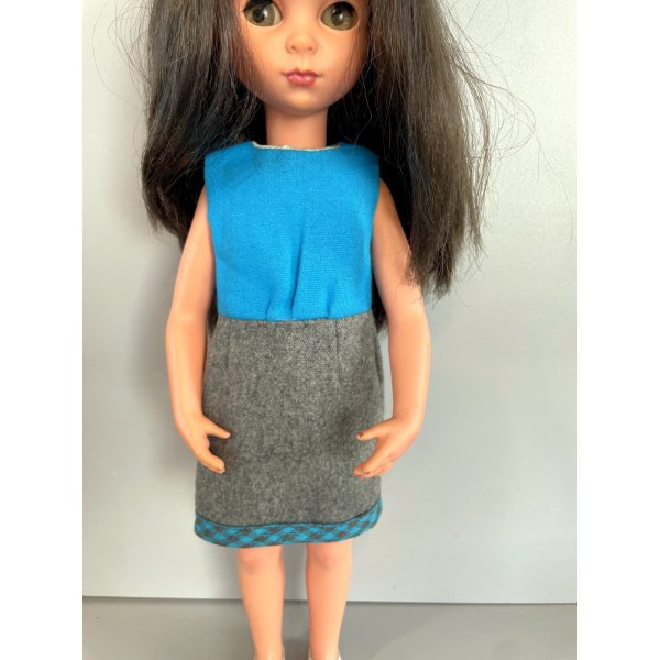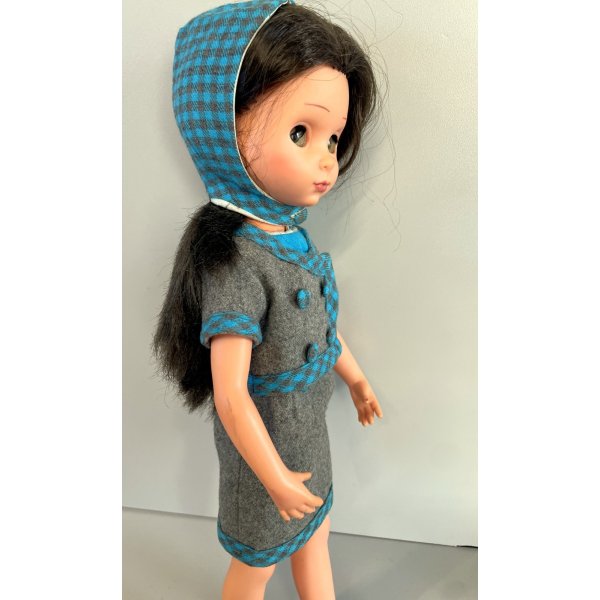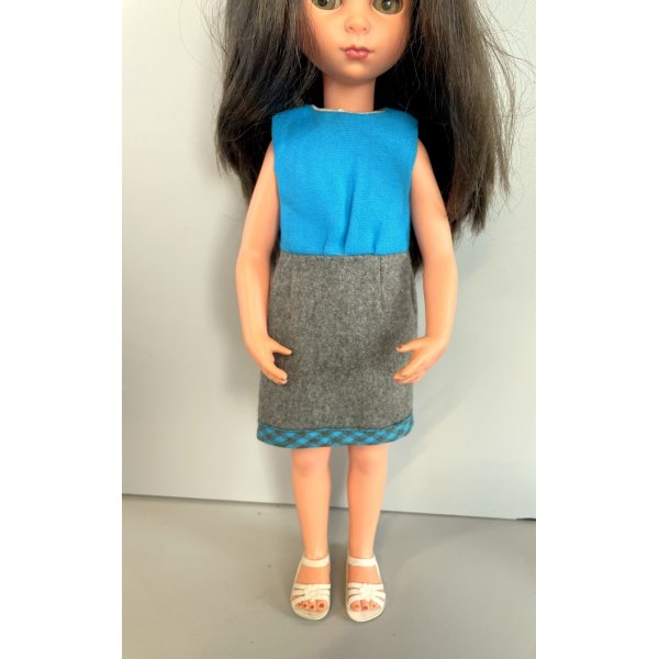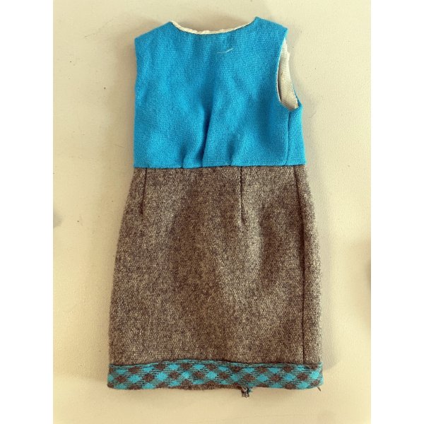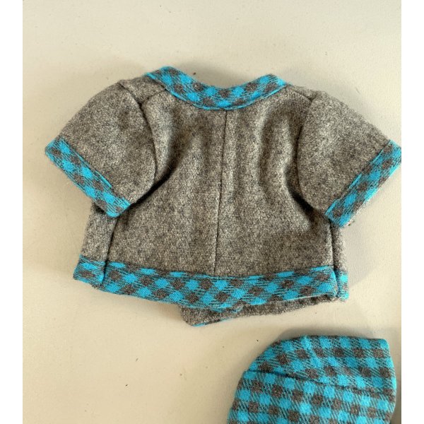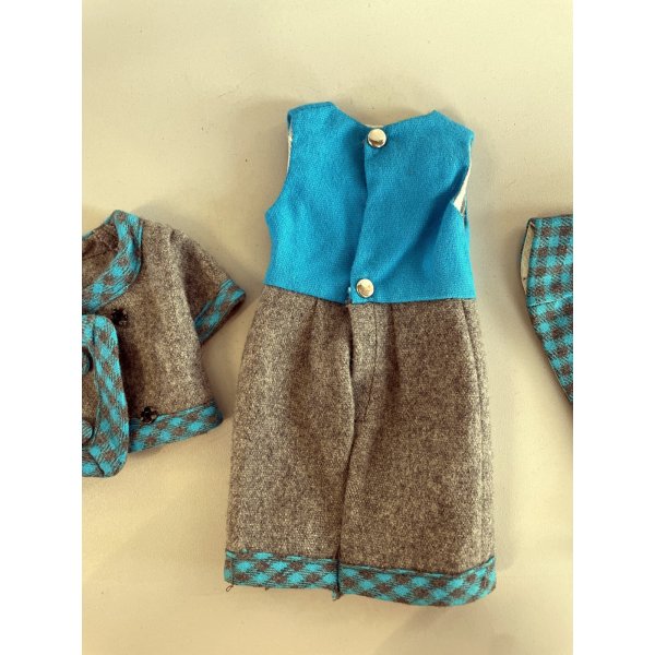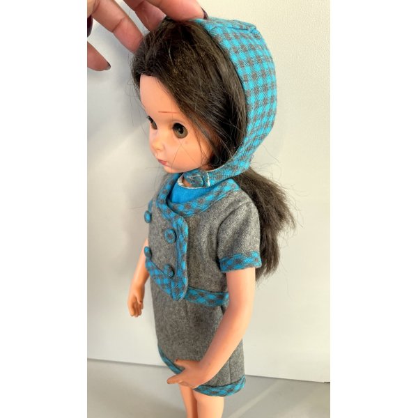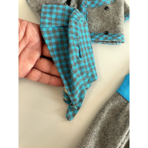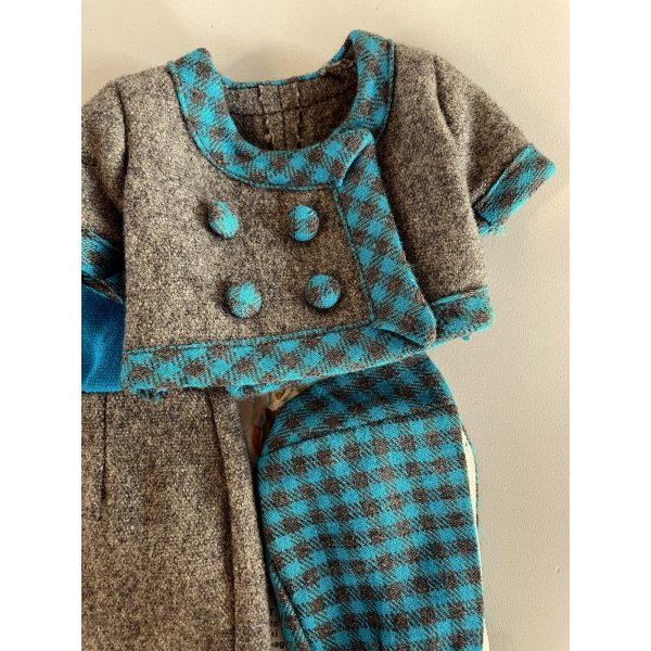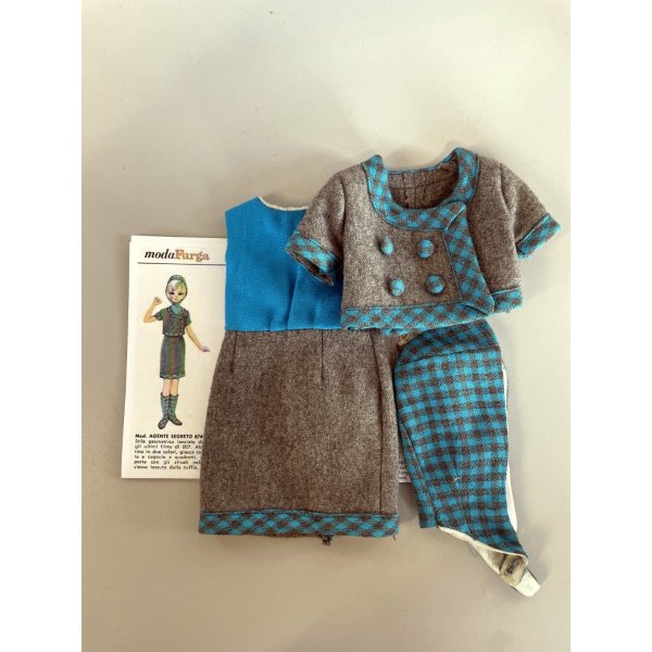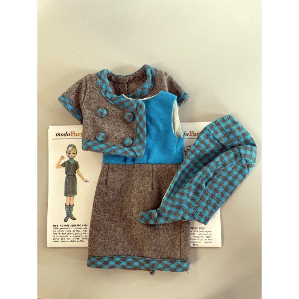 Bellissimo e raro completo 3 pezzi FURGA ALTA MODA 3 ESSE. Fa parte del Modello AGENTE SEGRETO 8769 in lana grigio e azzurro con motivi geometrici. Abito+giacca e copricapo.