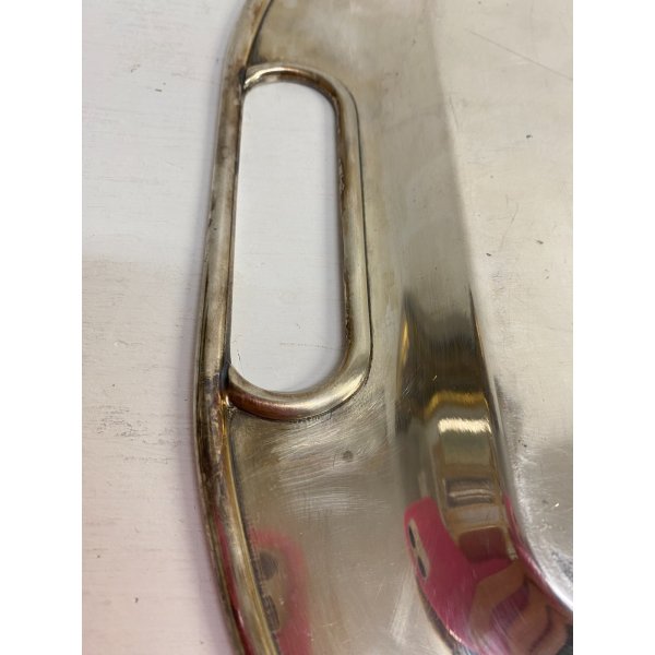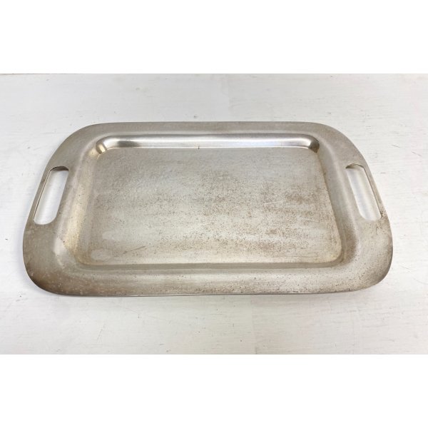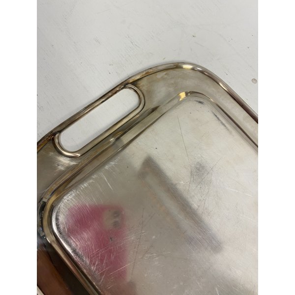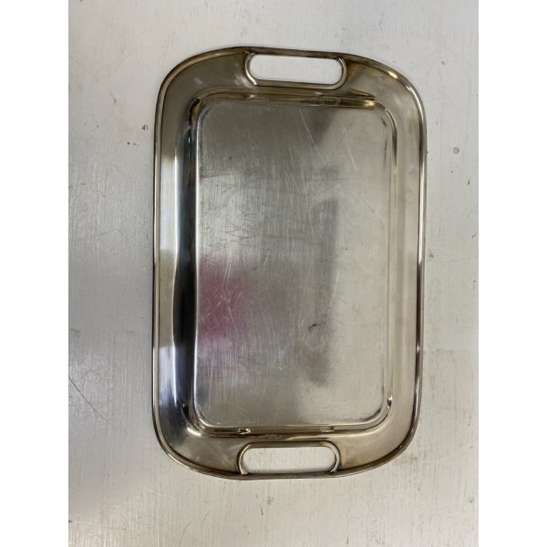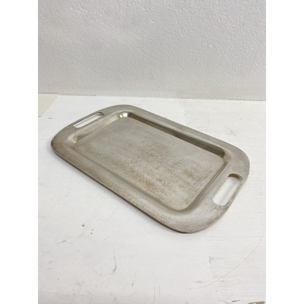 Stupendo piccolo vassoio rettangolare con angoli stondati e prese integrate nel bordo. Realizzato in metallo argentato, il suo design è elegante, minimale, la superficie, seppur segnata dal trascorrere del tempo, conserva una lucentezza delicata che ne esalta l'eleganza. Privo di marchio d'attribuzione, questo oggetto si distingue per la sua versatilità: perfetto per servire piccole portate. Dimensioni: 35,7 x 22,7 cm