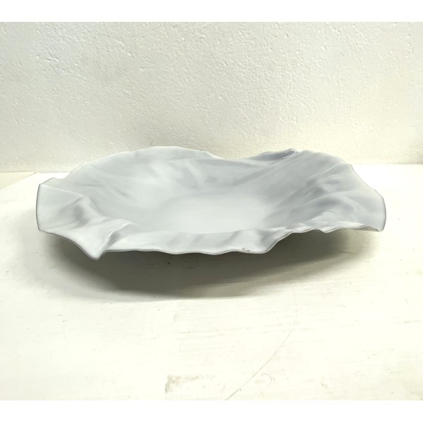Stupenda fruttiera in acciaio 18/10 modelo "Sarrià" color "Milky White" con leggeri riflessi grigi. Bowl disegnata da Lluis Clotet nel 2001 per Alessi, caratterizzata da una superficie accartocciata con forma irregolare del diametro di ø 37 x 6 cm/h circa. Marchio Alessi Lluis Clotet 2001 al verso sul profilo.