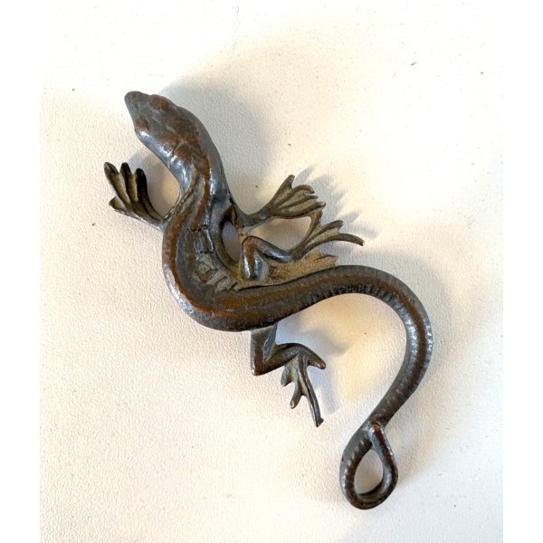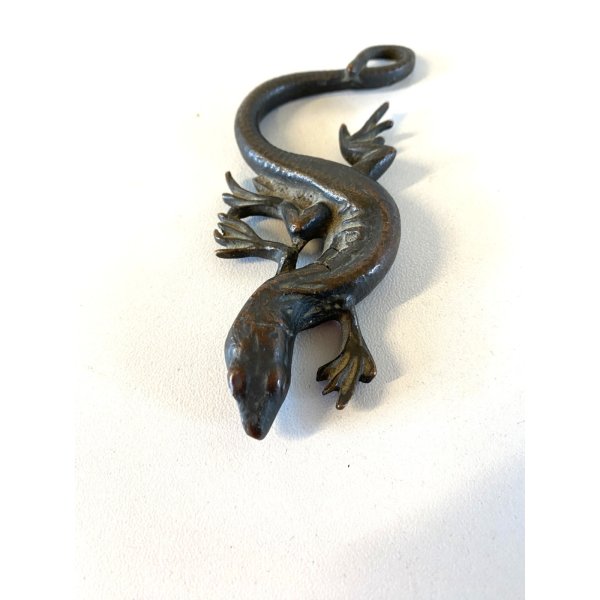 Stupenda scultura, figura in bronzo patinato rappresentante una lucertola, la cui coda forma un anello, un gancio. non presenta firma. Sulla curvatura del corpo si intravede un monogramma MP (?). Di piccole dimensioni lunga 10,5 cm circa
