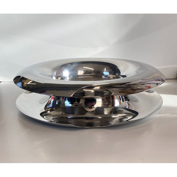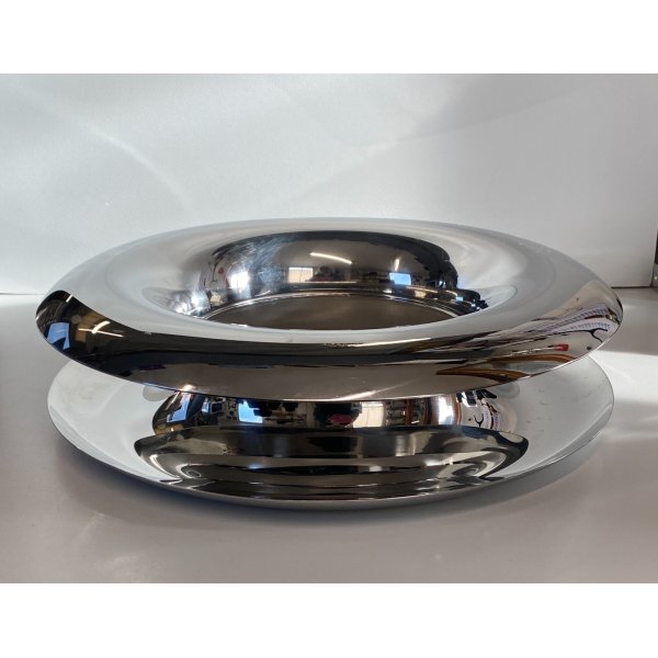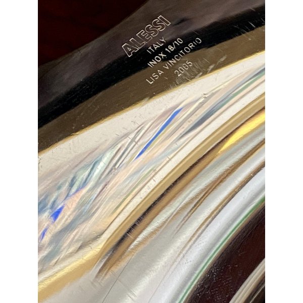Stupenda fruttiera in forma di anello (Mod. LV01) Fruit Loop Design Lisa Vincitorio per ALESSI prodotta nel 2005, marchio sul profilo. Dimensioni: ø 34,5 cm. Vintage con leggeri segni del tempo, graffietti da appoggio