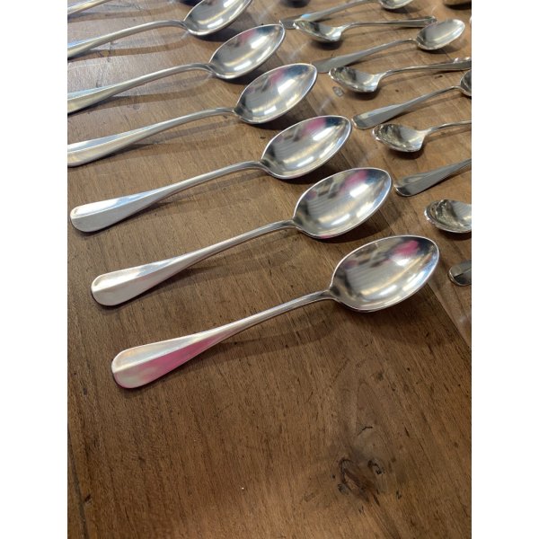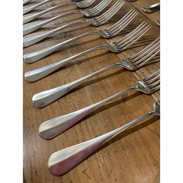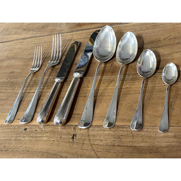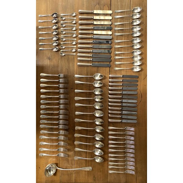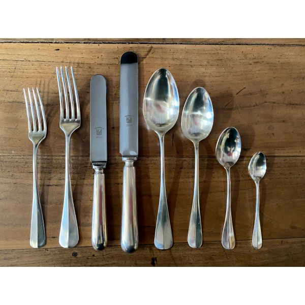 Dimensioni: Composto da 12 coltelli grandi 25 cm - 12 cucchiai grandi 21,3 cm - 16 forchette grandi 21,3 cm - 12 cucchiai dessert 19 cm - 12 coltelli dessert 21,2 cm - 11 forchette dessert 18,6 cm - 7 cucchiaini da the 14,5 cm - 12 cucchiaini da caffè 11,8 cm