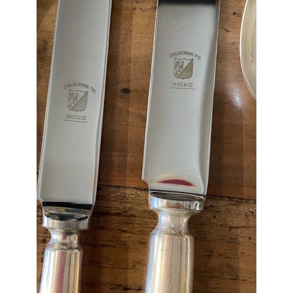 Stupendo servizio di posate vintage, prodotte da Calderoni F.lli nella metà de '900, completo per 6 persone - 94 pezzi: 12 coltelli grandi 25 cm - 12 cucchiai grandi 21,3 cm - 16 forchette grandi 21,3 cm - 12 cucchiai dessert 19 cm - 12 coltelli dessert 21,2 cm - 11 forchette dessert 18,6 cm - 7 cucchiaini da the 14,5 cm - 12 cucchiaini da caffè 11,8 cm. In ottime condizioni conservative. Marchio d'attribuzione su ogni pezzo, coltelli con manico cavo e lama inoxid. Servizio contenuto in custodie di tessuto di alta qualità color bordeaux, con stampato il logo F. Calderoni, un tocco di classe e riconoscibilità.