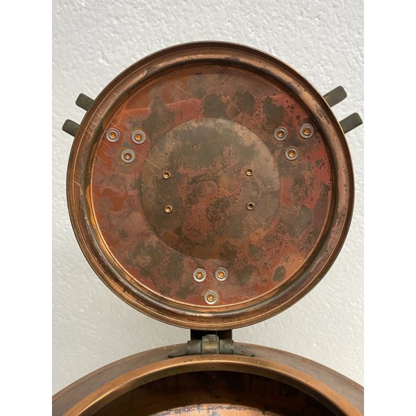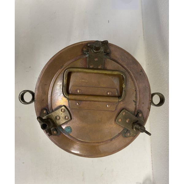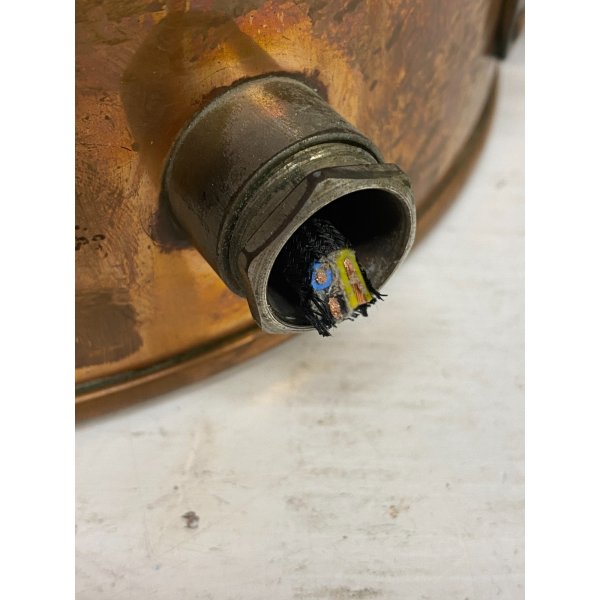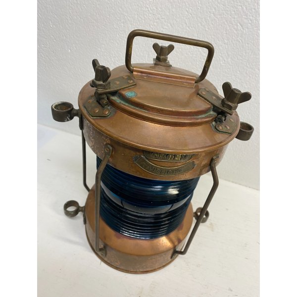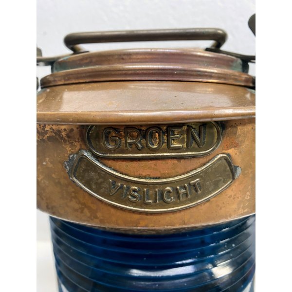Stupenda lanterna in rame e vetro stampato color blu. "Groen Vislicht" è la marca della lampada, che tradotto dall'Olandese "Green Fish light" - "Lanterna a luce verde per pesca". Questa lampada è stata elettrificata, è mancante della spina, presenta un vetro blu ed è completa di porta lampada. Tutto visibile dalle fotografie allegate all'inserzione