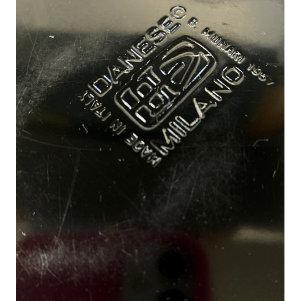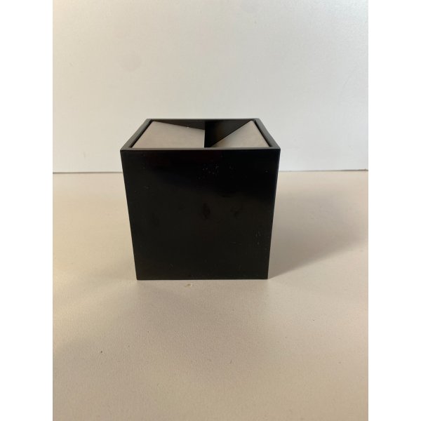 Stupendo posacenere modello "Cubo" disegnato da Bruno Munari prodotto da Danese nel 1957. Si compone di due parti: una scocca in materiale plastico, melammina color nero e una lamina in alluminio piegato la cui conformazione ad angolo crea una fessura capace di accogliere e nascondere il contenuto. Marchio "Danese Milano 1957" impresso sulla base. Esternamente in buone condizioni estetiche, originale d'epoca, segnalo evidenti segni di utilizzo, aloni al suo interno. Analizzare tutto attraverso le foto allegate in inserzione.