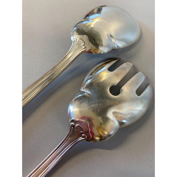 Elegante set per il servizio di insalate, composto da cucchiaio e forchetta (22 cm). Prodotti da F.lli Calderoni nella metà del '900, realizzati in metallo argentato punzonati sul manico. Segnalo aloni sulla forchetta