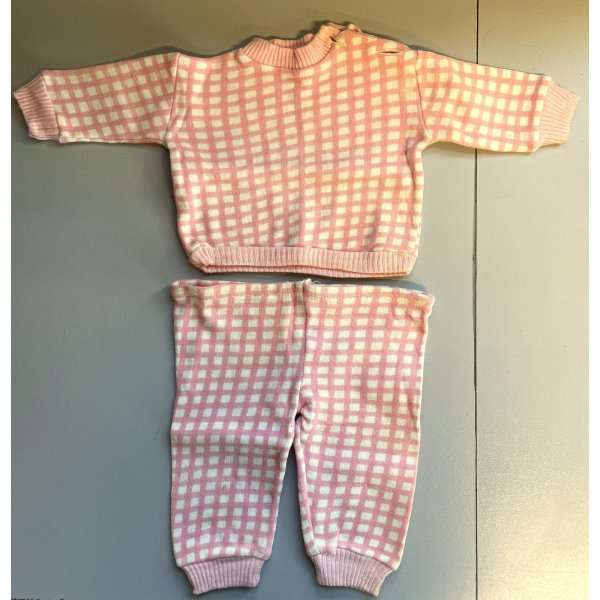 Delizioso e originale completino Furga per Giovannina, morbido pigiamino in jersey di cotone a quadretti bianco e rosa con profili in tinta unita ai polsi collo , maniche e fondo pantaloni.
