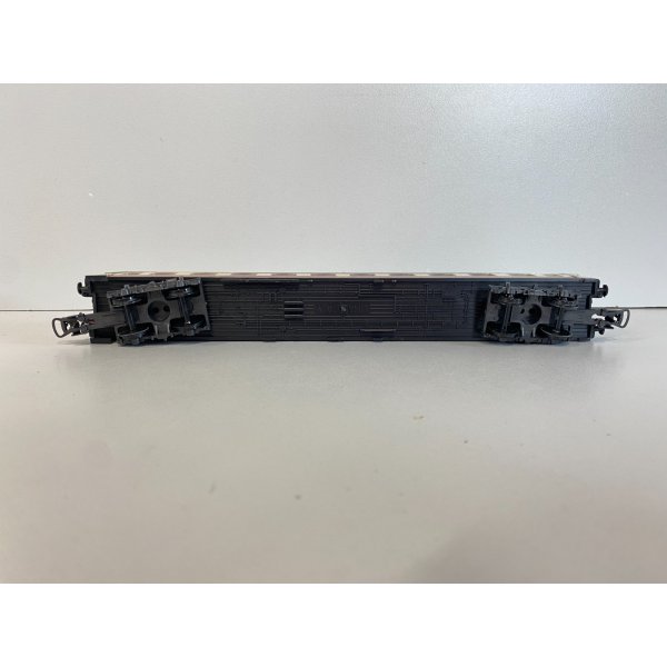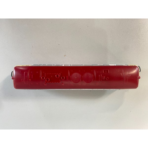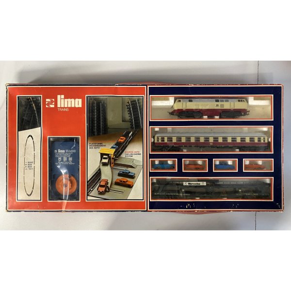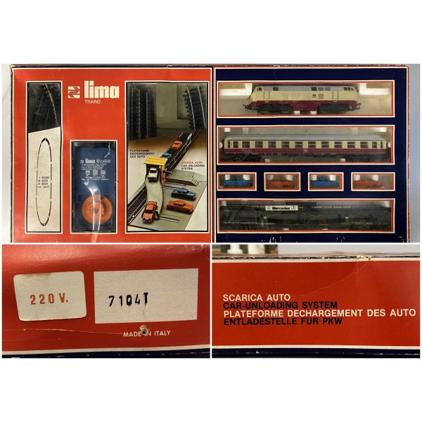 Stupendo set di modellismo ferroviario prodotto da Lima Trains negli anni '70. In buone condizioni estetiche, giocato, amato, presenta alcuni segni di utilizzo dei componenti e della scatola (originale) come strappi, polvere e piccole mancanze di polistirolo. Il set comprende: Una locomotiva, una carrozza passeggeri e un sistema di Carico e scarico, marchio Mercedes, 4 macchinine, un circuito ovale di binari (120 x 75 cm) una piattaforma in plastica con rampa per scaricare le macchine dalla bisarca, un casello giallo e un Alimentatore/trasformatore elettrico. Tutto visibile dalle foto. Funzionante osserva il breve video allegato