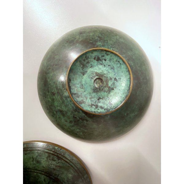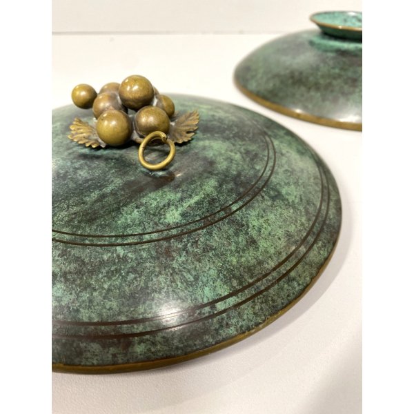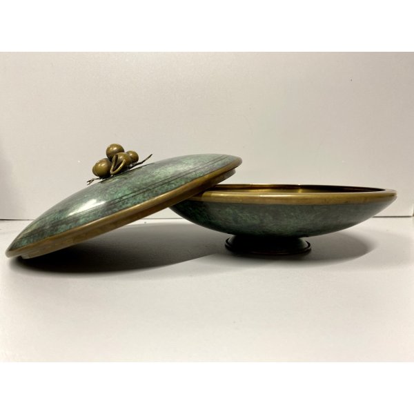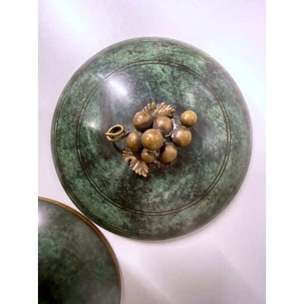 Stupenda antica ciotola/bowl con coperchio e piede in ottone ossidato produzione italiana anni '30/'40. La presa sul coperchio è formata da una decorazione in forma di grappolo d'uva. Non presenta marchi d'attribuzione e/o firma, per disegno, materiali e lavorazione, nello stile/ attribuibile a Carl Sorensen (1893-1979), architetto danese. Tutto visibile dalle fotografie allegate all'inserzione. Dimensioni: ø 19,5 x 10,5 cm/h