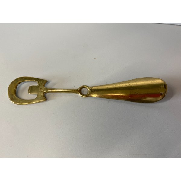 Stupendo calzascarpe vintage, realizzato in ottone lucido, anticato. Pratico e robusto, presenta un manico in forma di staffa o ferro di cavallo, utilizzabile anche per appenderlo. Inciso sul manico il marchio: "Vezzani", probabilmente il nome del produttore o il marchio delle scarpe pubblicizzate.