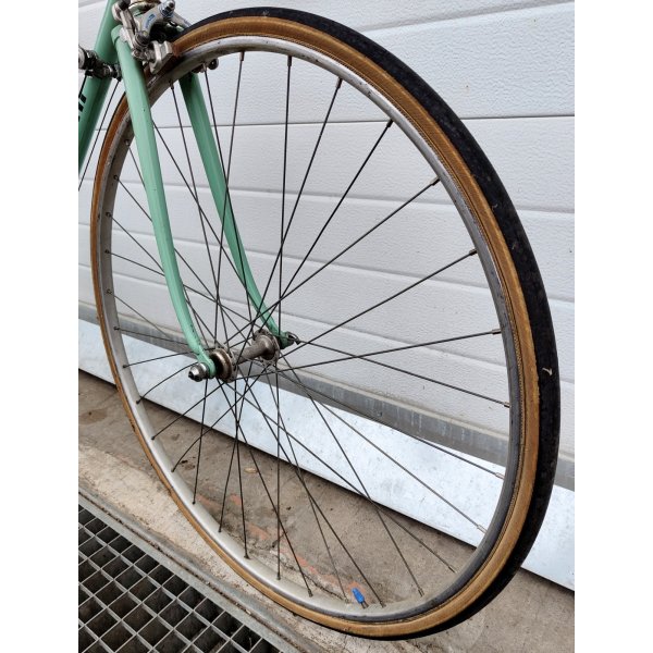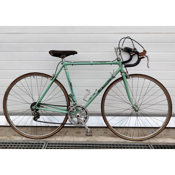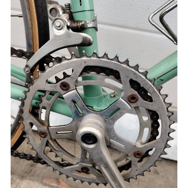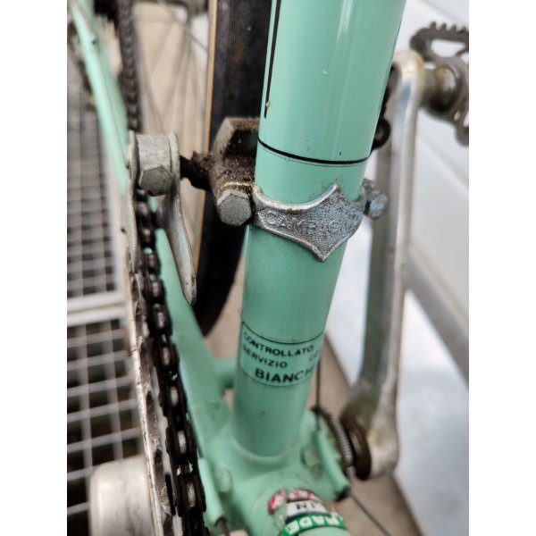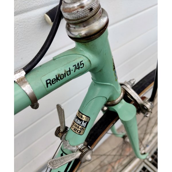 Bianchi Rekord 745 00.4.18, originale d'epoca, manubrio Edoardo Bianchi 3ttt, pedivelle Ofmega, Sella Italia mod. Grand Prix Prof., freni Universal Extra, componentistica e levette cambio Campagnolo, cambio Campagnolo Valentino Extra a 5 rapporti posteriori e 2 anteriori, ruote da 28''
