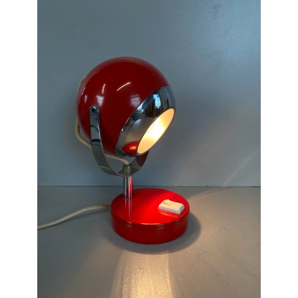 Fantastica abatjour vintage, lampada a sfera orientabile, gialla dal design moderno anni '60/'70 con struttura in metallo in parte cromato e in parte smaltato color rosso con calotta interna in allumino. Non presenta marchio d'attribuzione, design nello stile di Goffredo Reggiani, funzionante, l'impianto elettrico è originale d'epoca, spina non a norma, le sue condizioni sono visibili dalle foto allegate all'inserzione. La lampadina è presente a scopo esemplificativo.