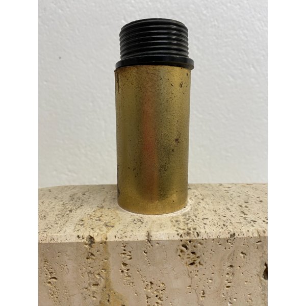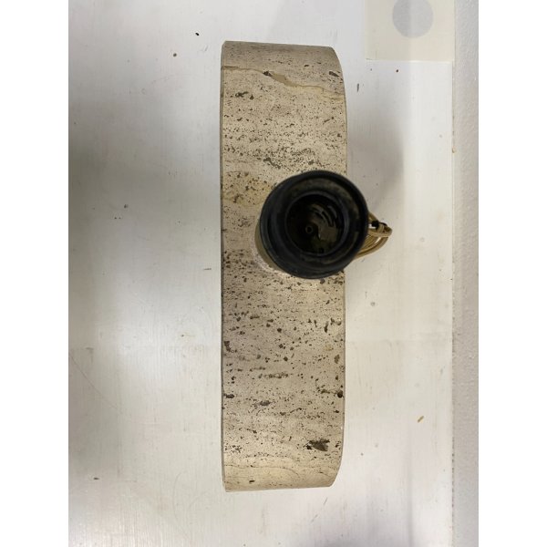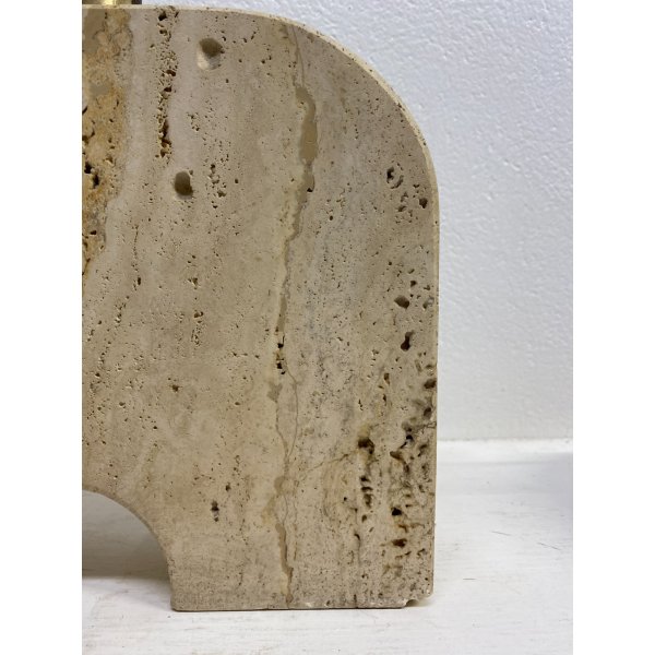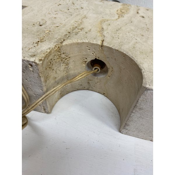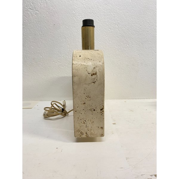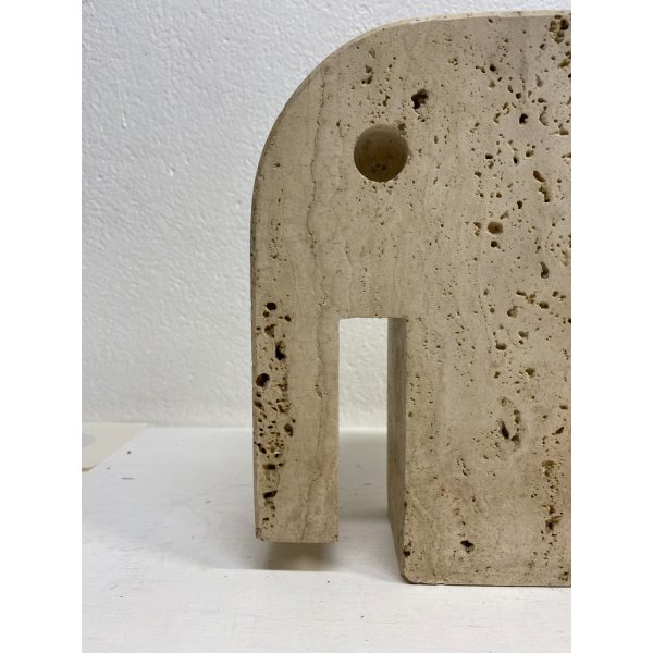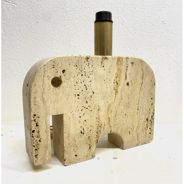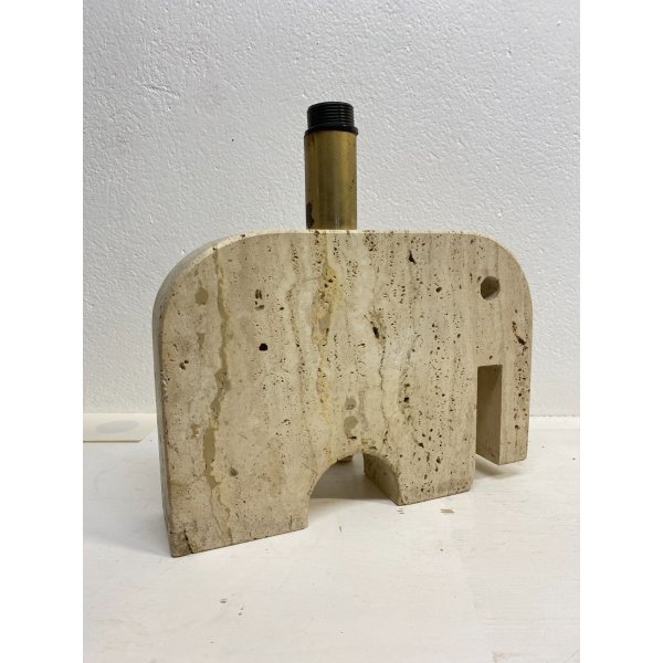 Bellissimo basamento minimalista per lampada da tavolo a forma di elefante, in travertino, pietra naturale che gli conferisce un aspetto unico e sofisticato. Non presenta marchio, design e lavorazione del travertino sono attribuibili ad una produzione dei F.lli Mannelli degli anni '70. Completo di porta lambada in metallo cromato/oro con segni del tempo, il cavo per l'alimentazione non funziona, va sostituito. Dimensioni: 24,5 x34,5 x 8 cm