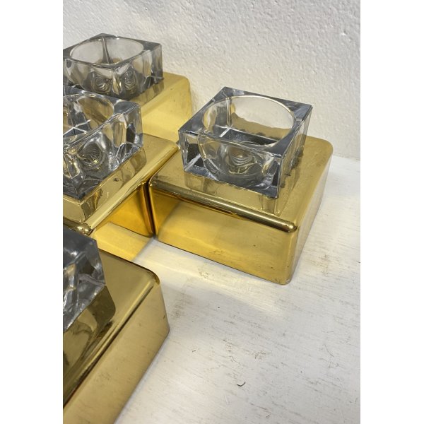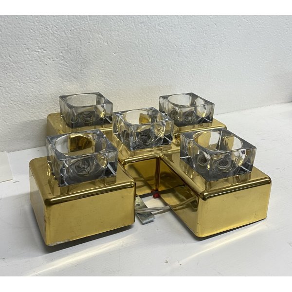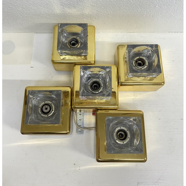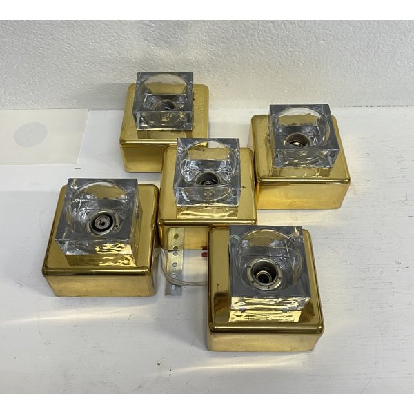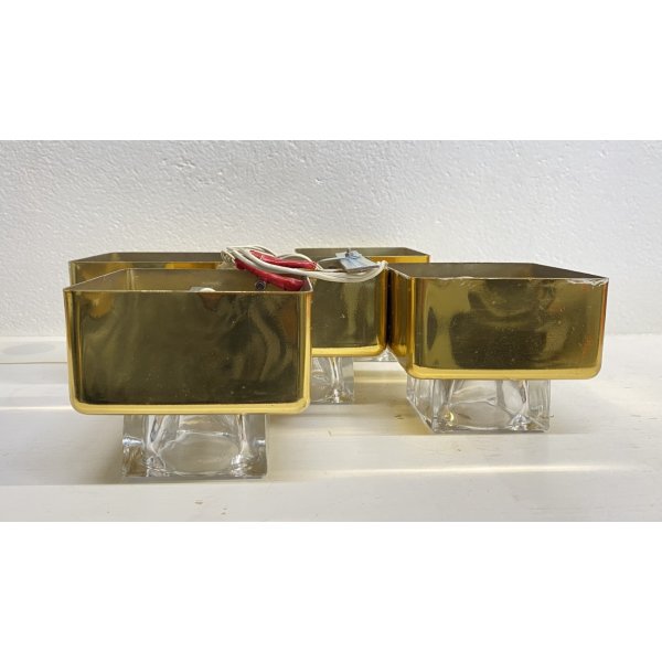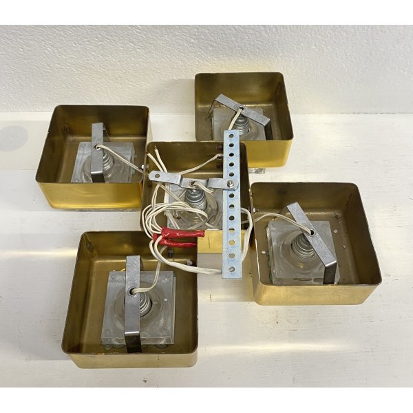 Fantastico lampadario a soffitto di design anni 70 con struttura in ottone e componenti in vetro. Non presenta firma, non ho ancora trovato il designer.