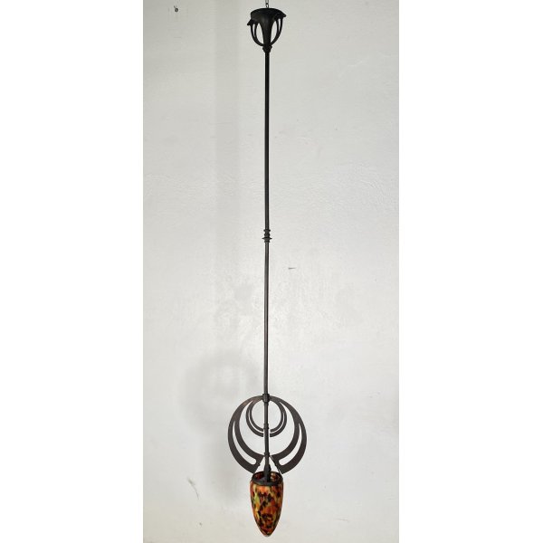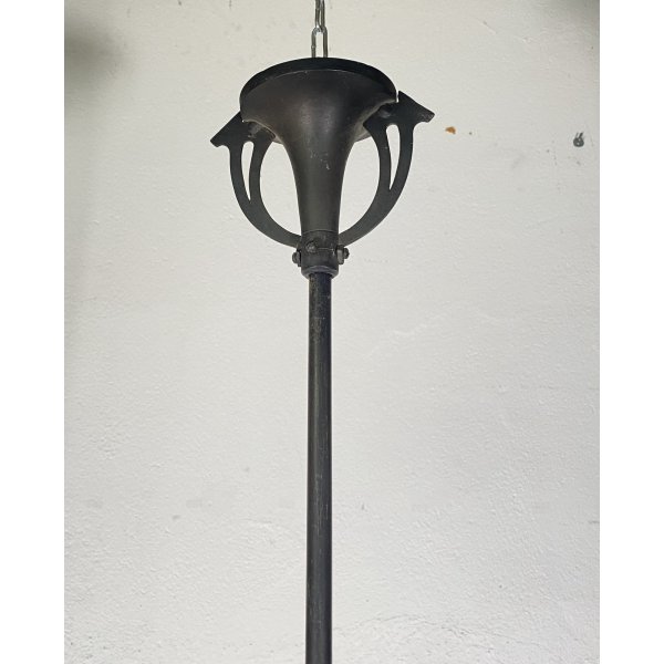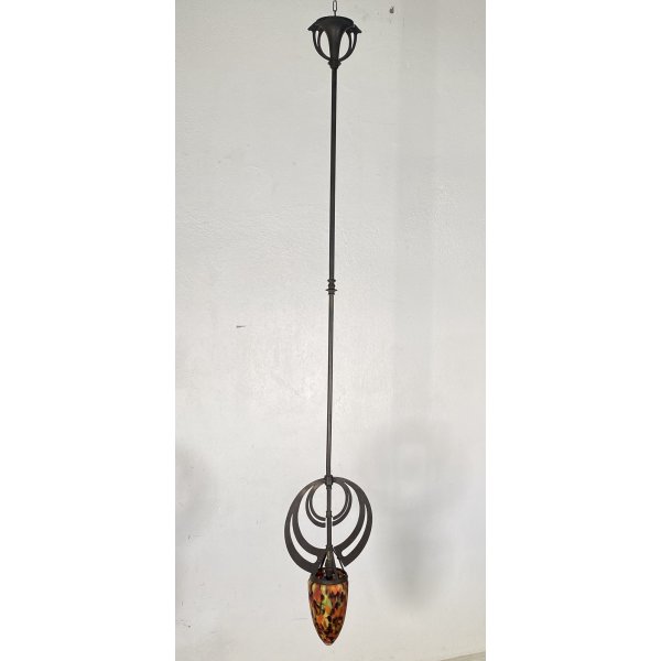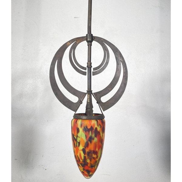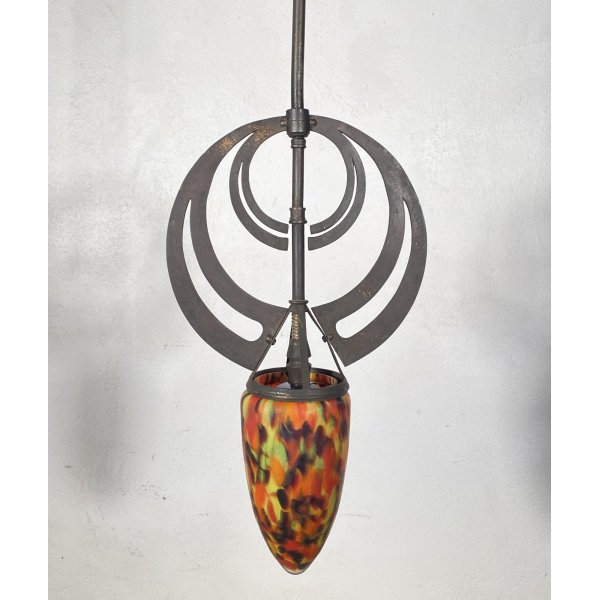 Stupendo lampadario in stile Art Nouveau dei primi del 1900, con una struttura realizzata in ferro e il cappellotto in vetro