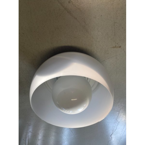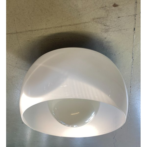 Stupendo lampadario da soffitto "Omega" designato da Vico Magistretti nel 1967 per Artemide, composto da 1 punti luce contenuto in una sfera interna con struttura in metallo e diffusore in vetro opalino bianco. Plafoniera icona del design modernista, in ottime condizioni, visibili dalle fotografie allegate. ø 50 x 32cm/h