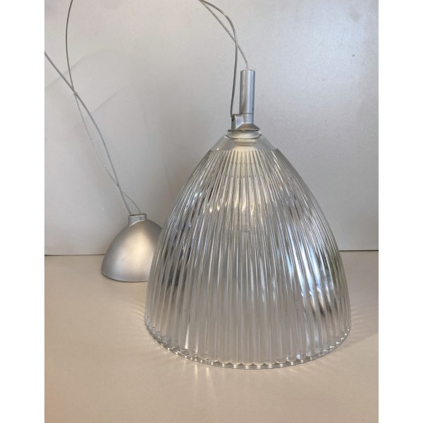 Lampada a sospensione disegnata Shigeaki Asahara mod. "Stresa" negli anni '90 prodotta da Lucitalia. La lampada è realizzata in vetro trasparente texturizzato e alluminio, con filo in acciaio, ad altezza regolabile