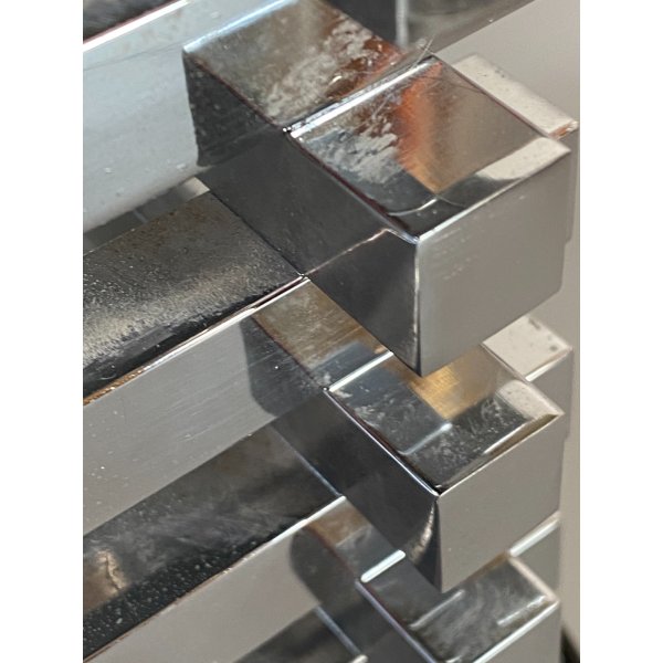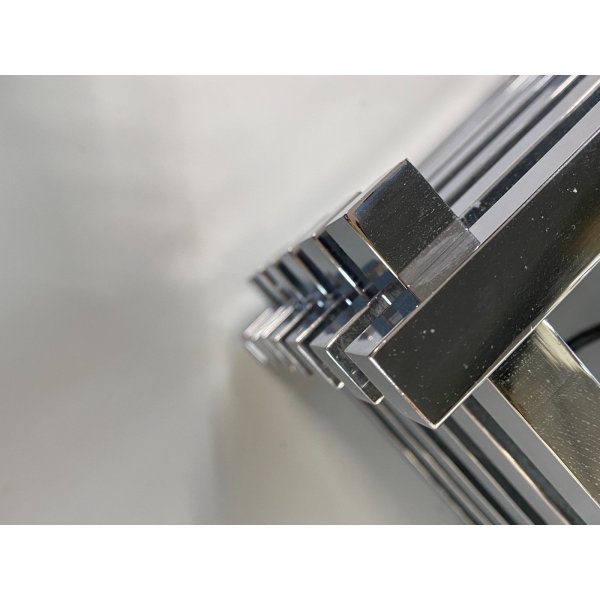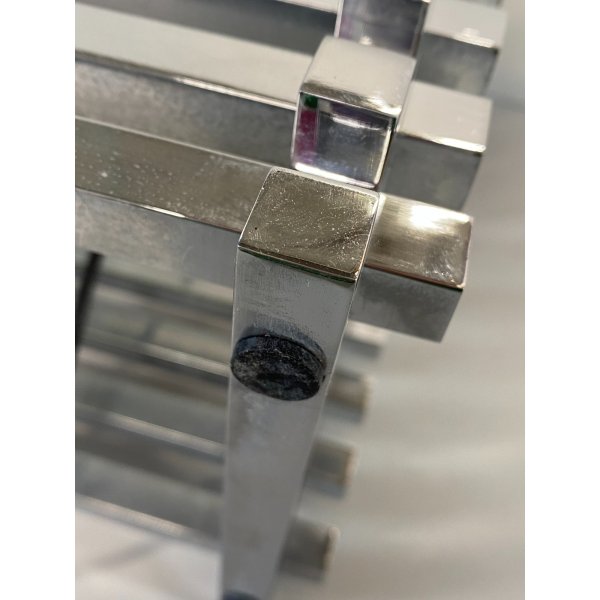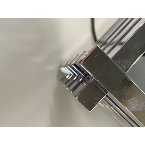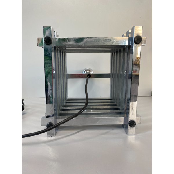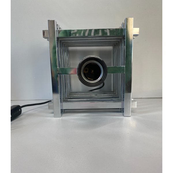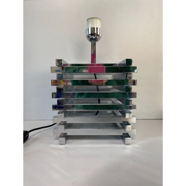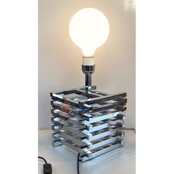 Stupenda lampada da tavolo dal design sofisticato, un perfetto connubio tra modernismo e glamour. La sua struttura è formata da una composizione geometrica in metallo cromato riflettente capace di creare effetti visivi affascinanti. Lampada priva di marchio d’attribuzione, il motivo strutturale a griglia, richiama lo stile pulito e minimalista tipico degli anni '70 di Romeo Rega o Gaetano Sciolari. La superficie lucida e le linee geometriche precise conferiscono alla lampada un’eleganza senza tempo, rendendola un pezzo di grande impatto estetico, capace di valorizzare ogni ambiente. Lampada originale anni '70, senza paralume e lampadine, segnalo piccoli punti di usura/fioritura della cromatua. Tutto visibile dalle fotografie allegate