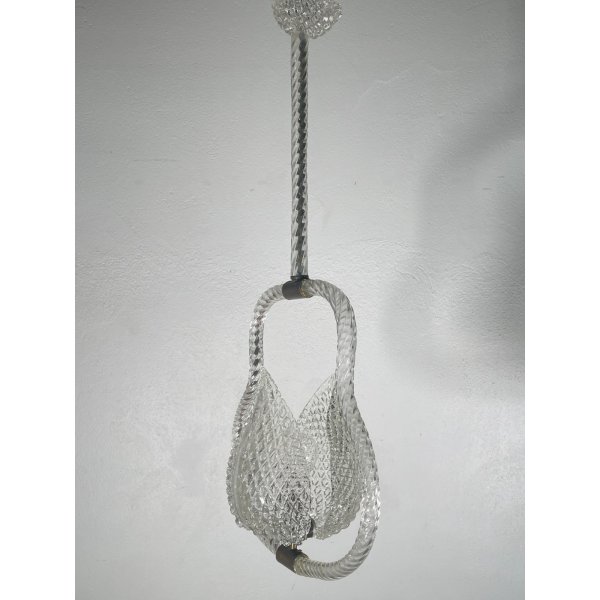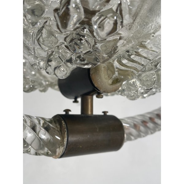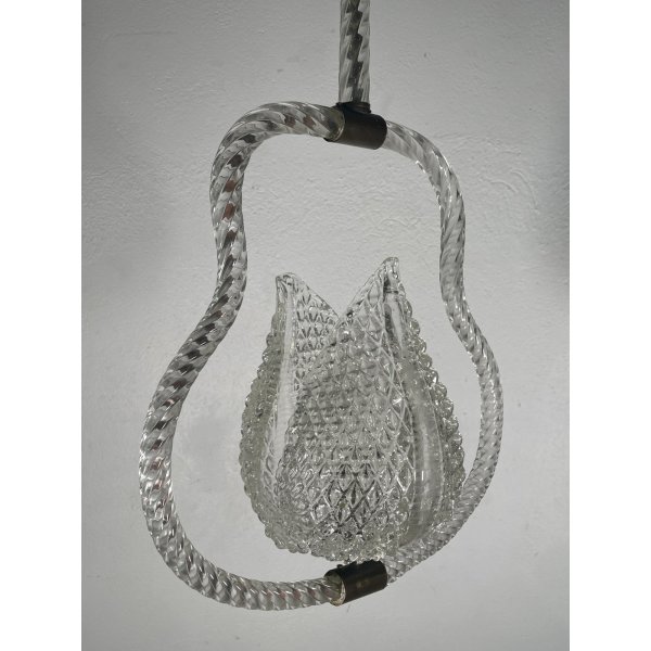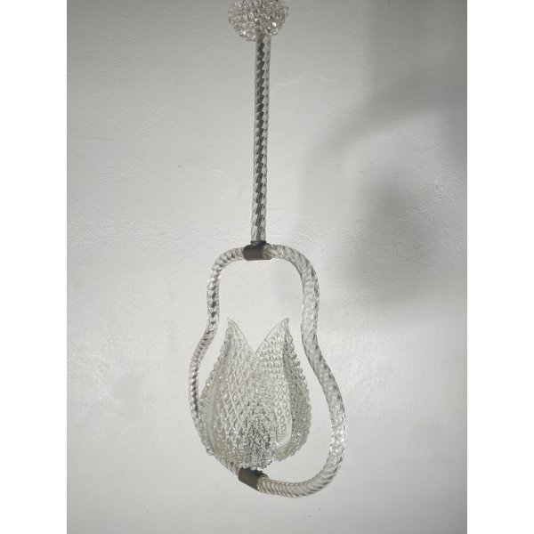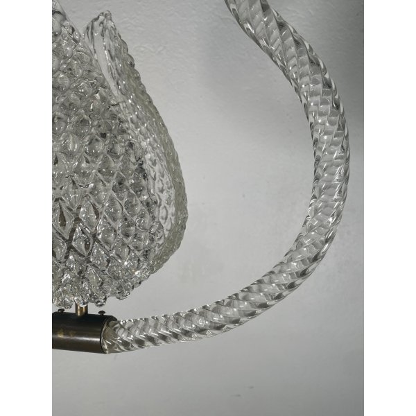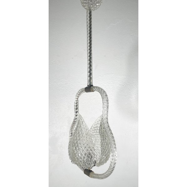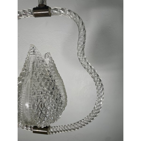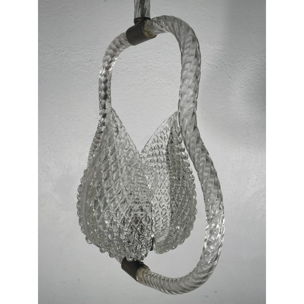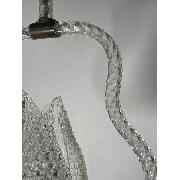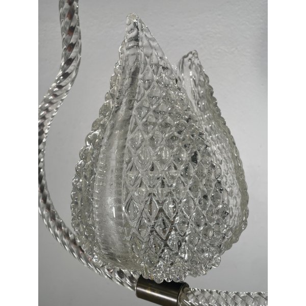 Stupendo ed elegante lampadario di Barovier & Toso in vetro di murano trasparente, un punto luce, presente una coppia di foglie tipiche di Barovier che ricoprono il punto luce, funzionante.