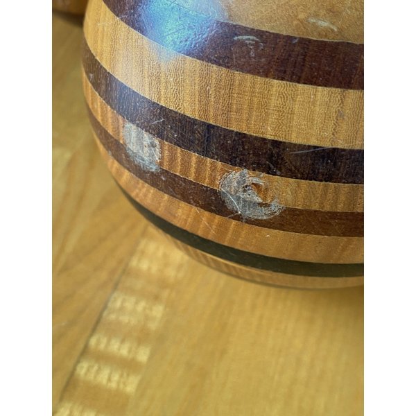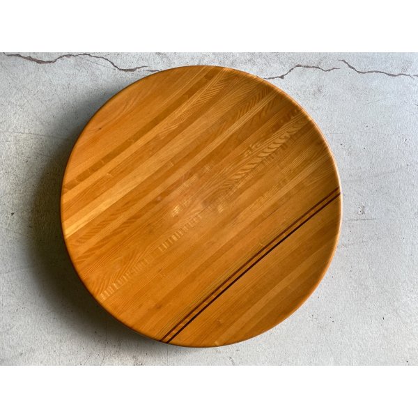 Stupendo grande piatto tornito con bordo stondato, composto da varie essenze di legno con due sfere caratterizzate da un motivo a strisce alternate, legno chiaro e legno scuro, ripreso sul piatto (Piatto ø 59x7 cm/h Sfere ø 10/8 cm). Centrotavola vintage anni '70/80 circa, in ottime condizioni conservative, con segni del tempo, compatibili con l'epoca e l'utilizzo. Sulla base il logo della manifattura su etichetta argentata "DELBRU"