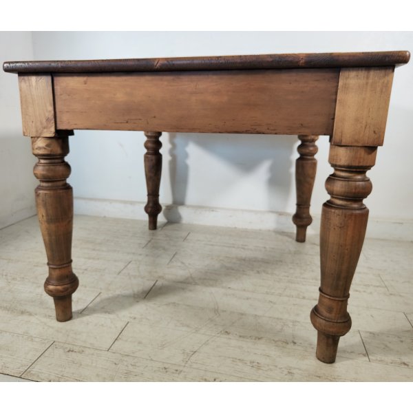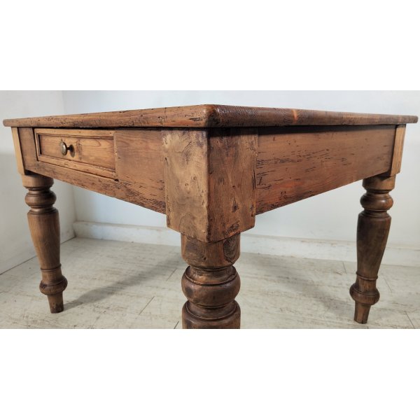 Delizioso ed antico tavolo da pranzo quadrato, originale d'epoca, in legno massello di abete, gambe in pioppo tornite, con cassetto frontale, già restaurato e lucidato a cera, pronto all'uso
