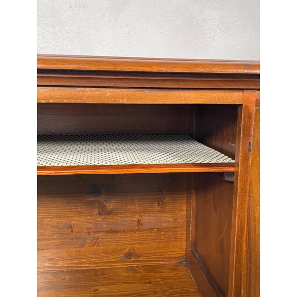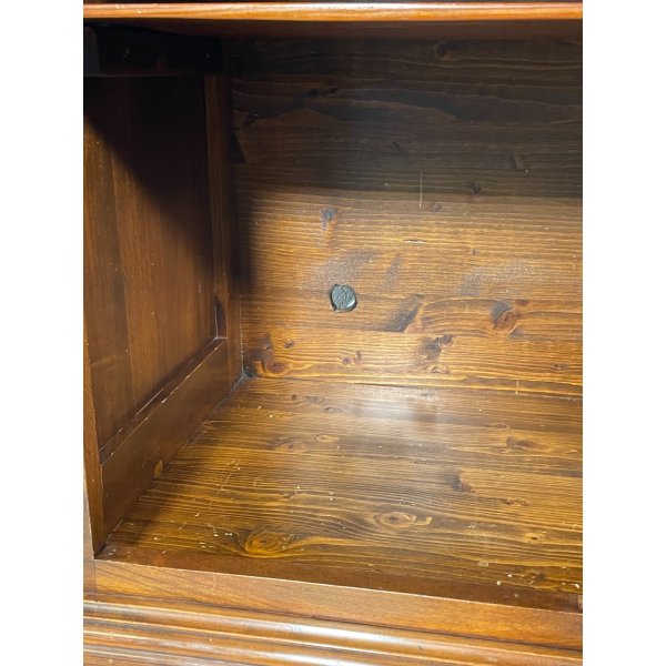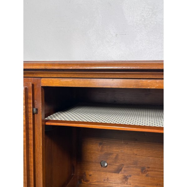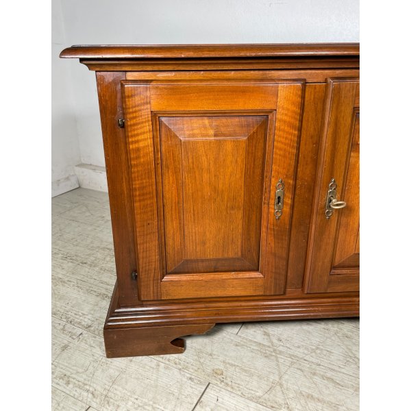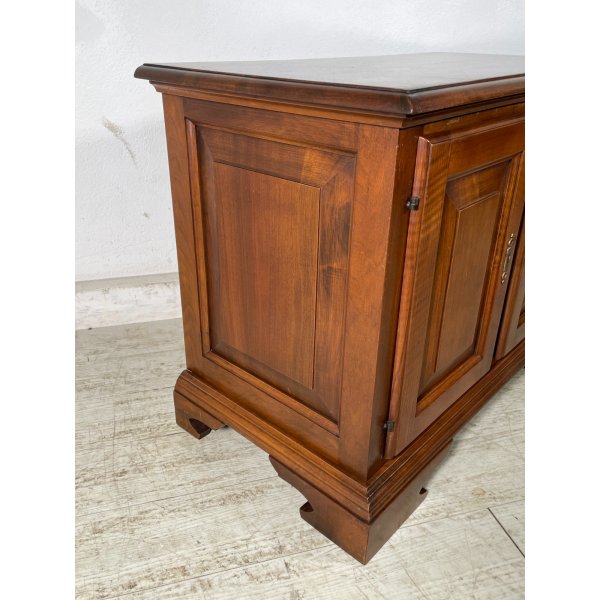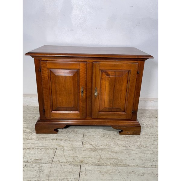 Deliziosa piccola credenza con doppia anta e ripiano interno, serratura funzionante, legno di noce, anni 80, mobile porta TV o utilizzabile come mobile stipo, presenta foro nella parte passa per far passare i cavi.