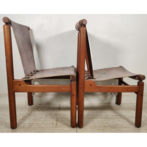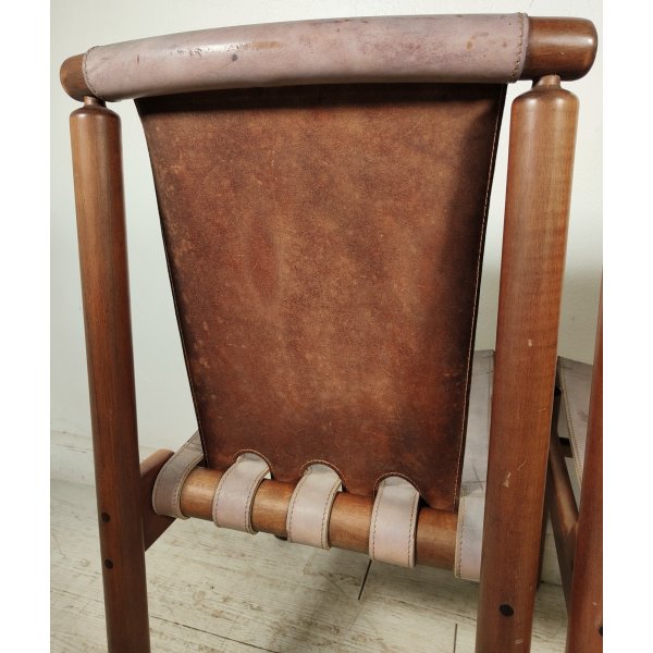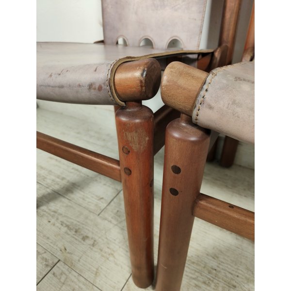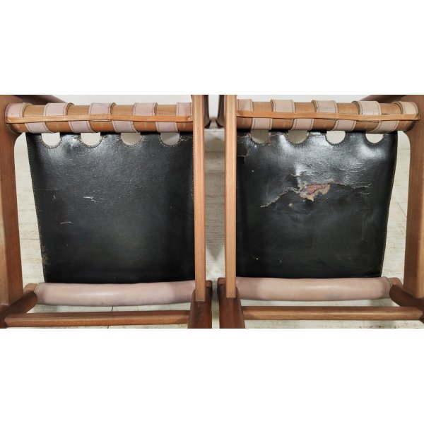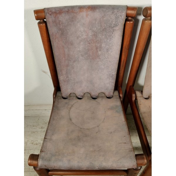 Condizioni: Buone condizioni generali, struttura in legno sana e stabile, presentano segni del tempo ed utilizzo come graffi e macchie sul legno e cuoio, 2 sedute nella parte nera sottostante presentano riparazioni della pelle nera applicata, il tutto visionabile attraverso le foto allegate in inserzione