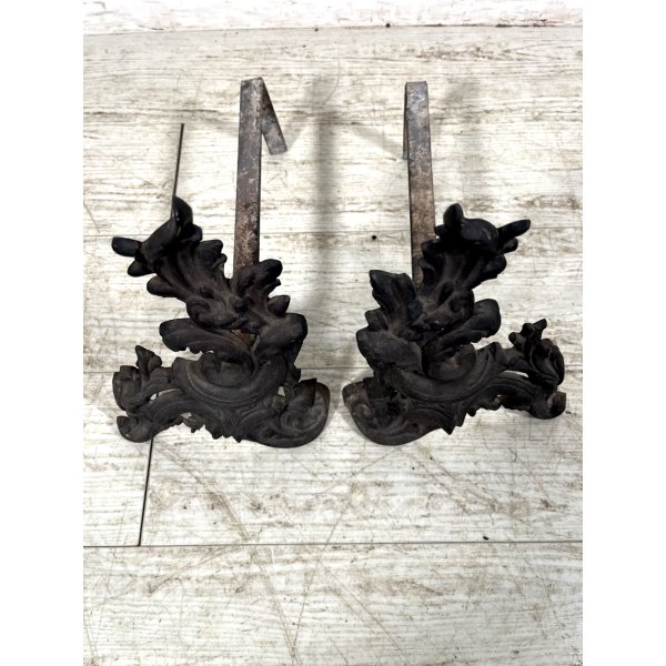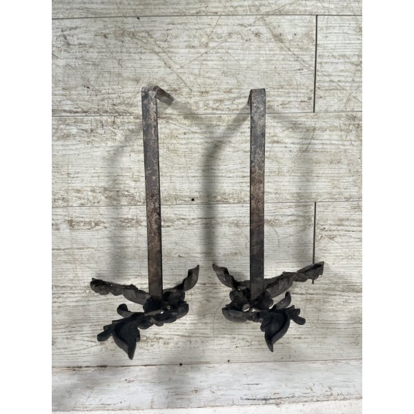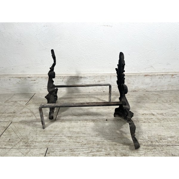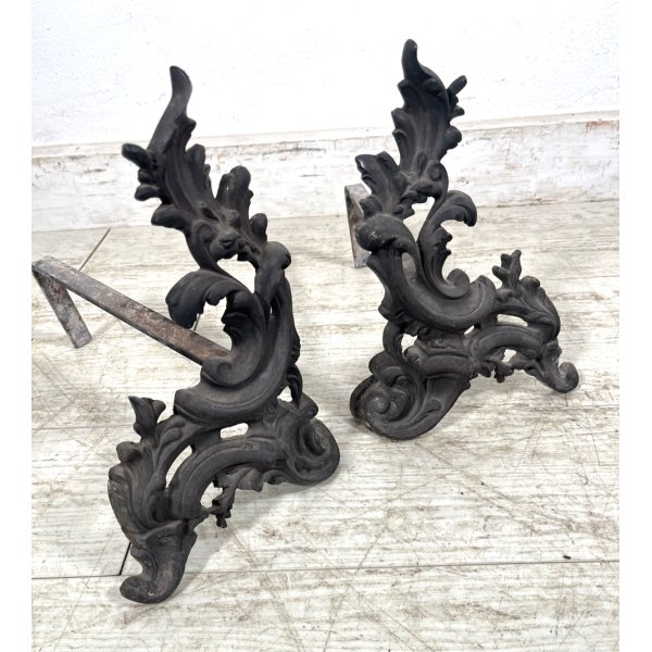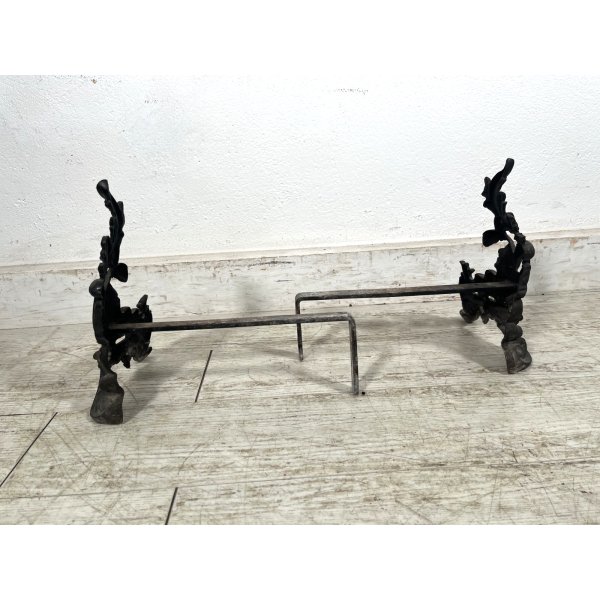 Stupenda coppia di alari in ferro dal design semplice decorati con motivo naturale in foglie d'acanto riccioli e volute. La loro superficie presenta segni del tempo e dell’utilizzo, come lievi ossidazioni e patina che testimoniano la loro storia e autenticità. La funzione di questi alari è quella di sollevare i ceppi di legna dal fondo del camino, favorendo una combustione più efficiente