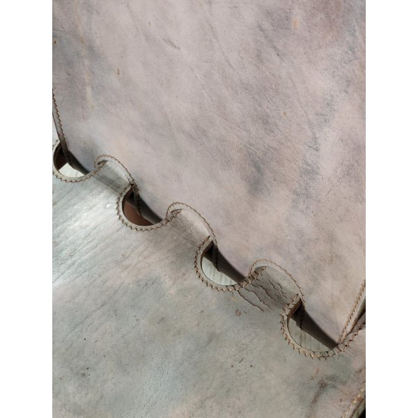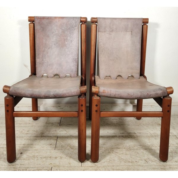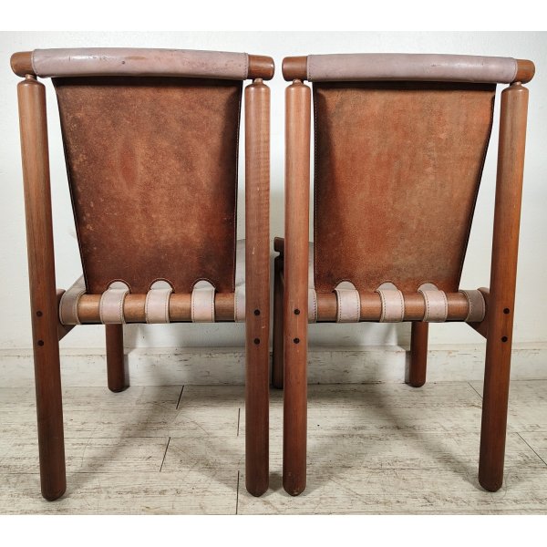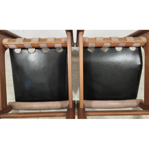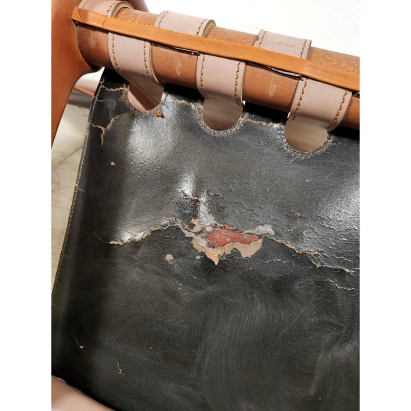 Condizioni: Buone condizioni generali, struttura in legno sana e stabile, presentano segni del tempo ed utilizzo come graffi e macchie sul legno e cuoio, 2 sedute nella parte nera sottostante presentano riparazioni della pelle nera applicata, il tutto visionabile attraverso le foto allegate in inserzione