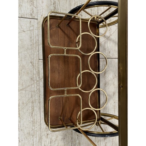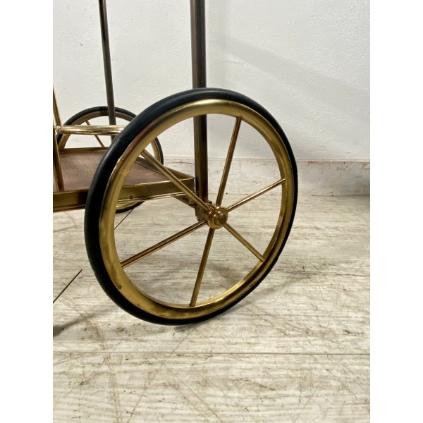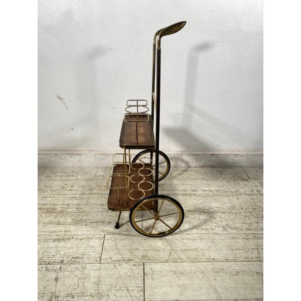 Fantastico carrello bar, design italiano in stile Golf Club Mid-Century-Modern, con ripiani in legno e portabottiglie in ottone con 2 ripiani e maniglie in forma di mazza da golf. Le dimensioni contenute lo rendono perfetto per spazi ridotti, senza rinunciare a stile e funzionalità.