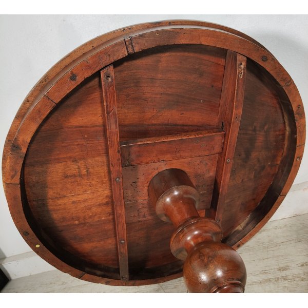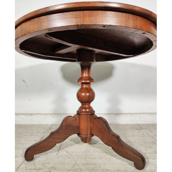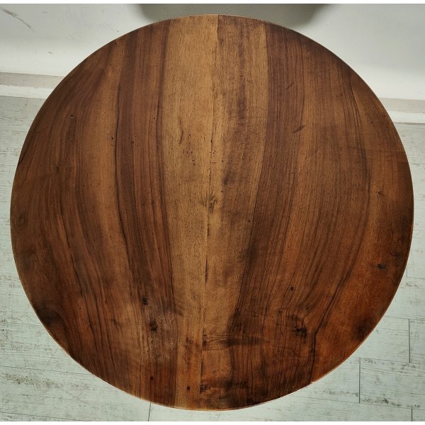 Elegante ed antico tavolo rotondo ottocentesco, originale d'epoca, in legno massello di noce con 3 gambe sagomate e colonna centrale tornita, piano a 2 plance in biglia