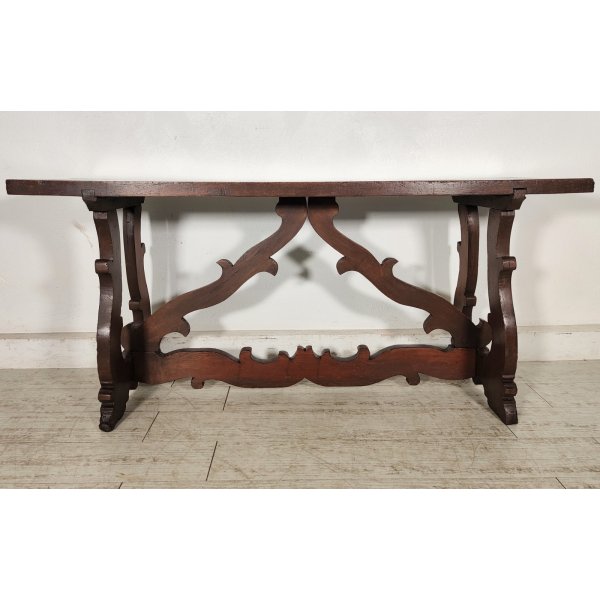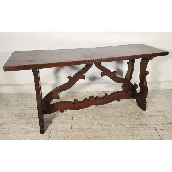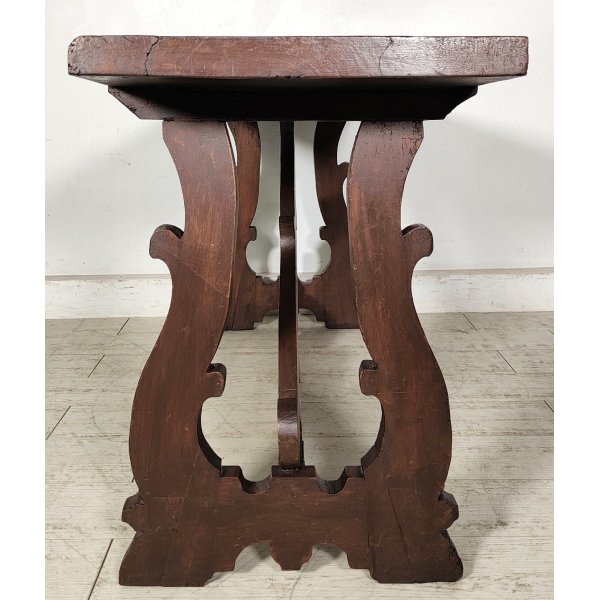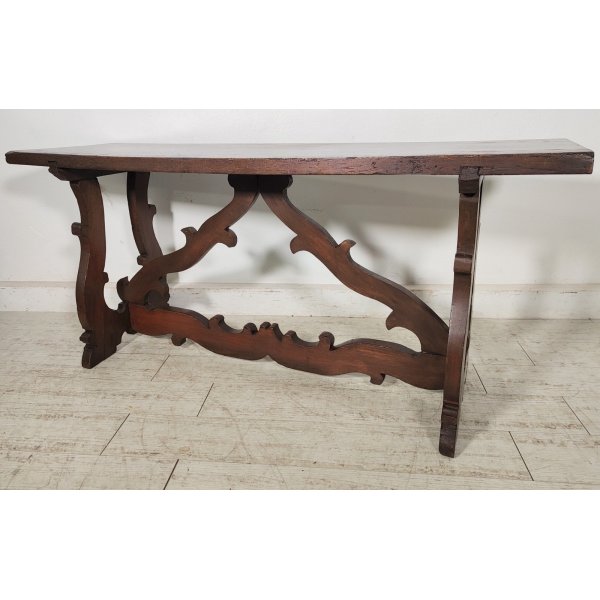 Antico tavolo a consolle fratino, originale d'epoca, in legno di noce massello con gambe a lira, tavolino rettangolare da salotto