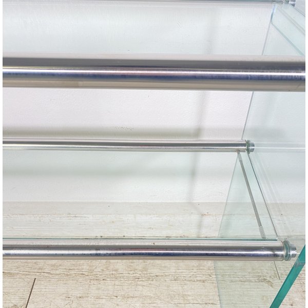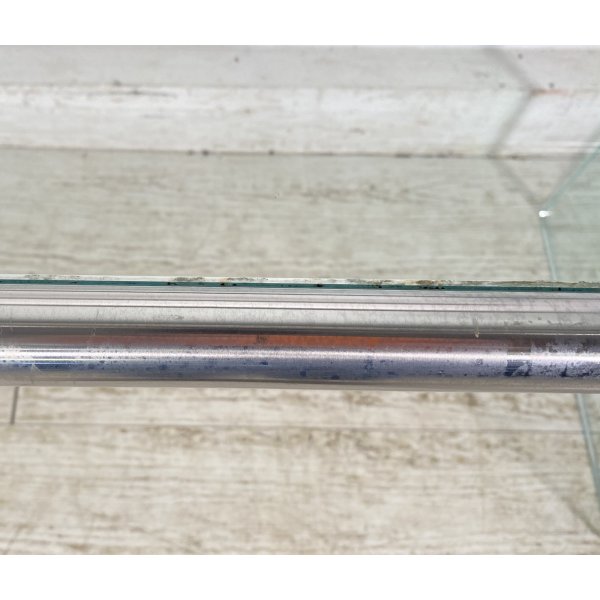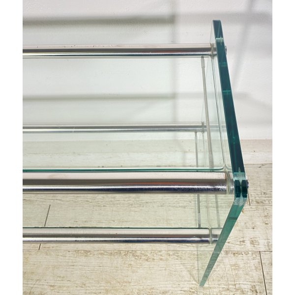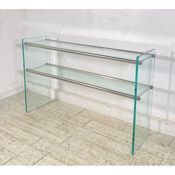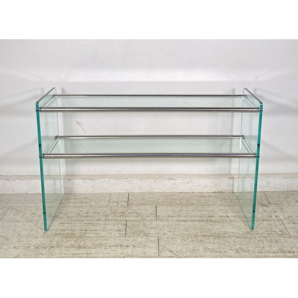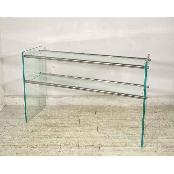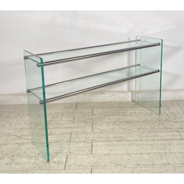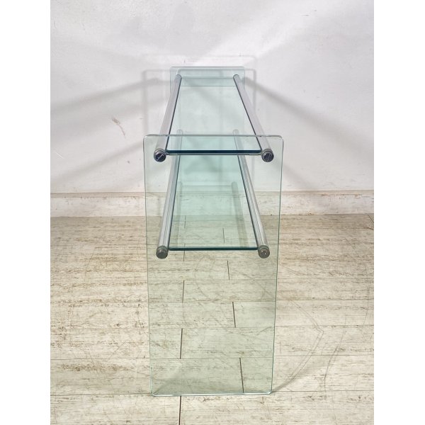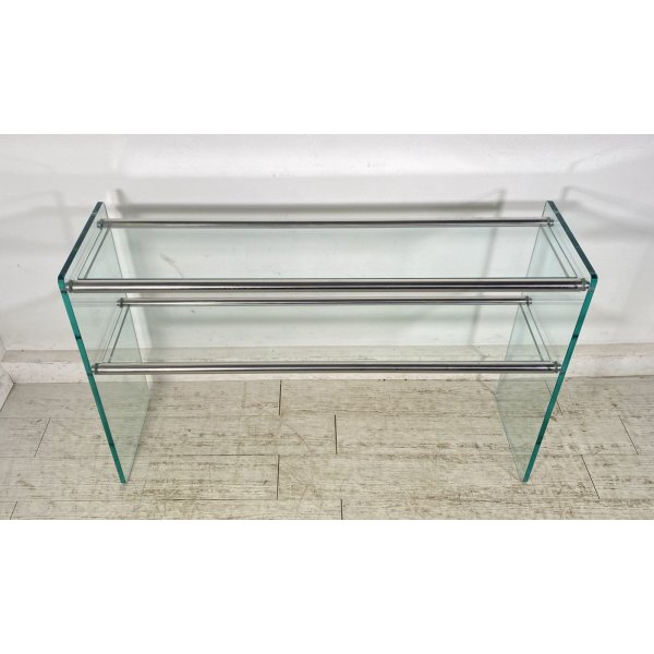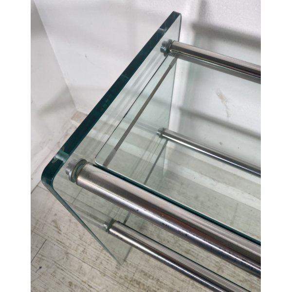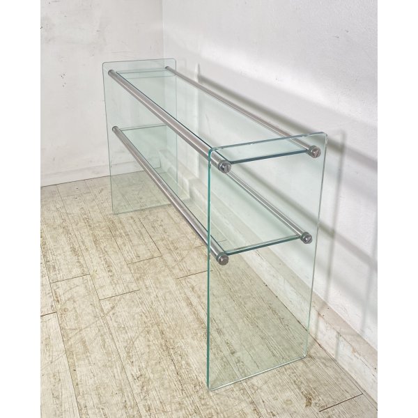 Fantastica consolle a muro e da centro, ideale per un salotto salotto anni 70, composta da una struttura in vetro, 4 tubi di acciaio cromato e 2 ripiani sempre in vetro