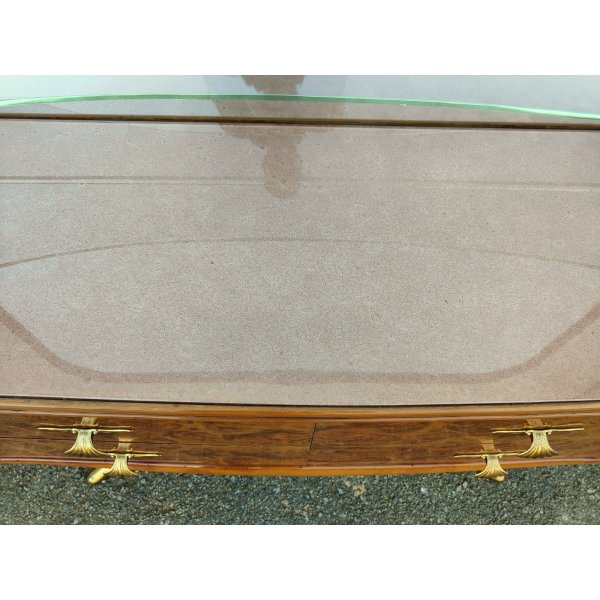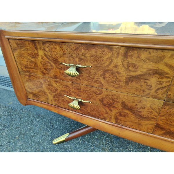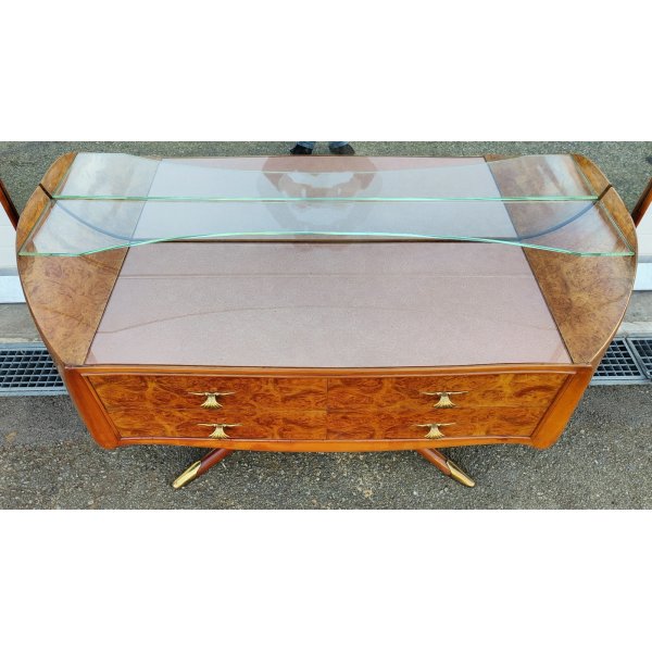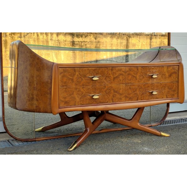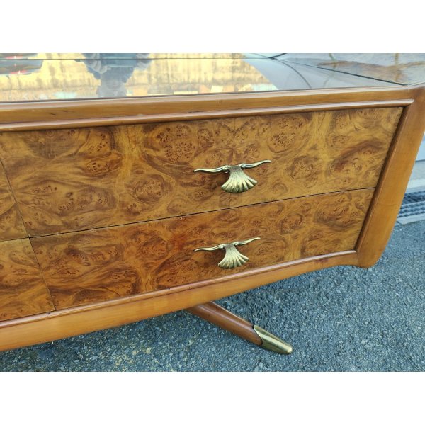 Splendid cassettiera a 4 cassetti e ripiani in vetro in stile Art Déco, con specchiera integrata, struttura sorretta frontalmente da 2 gambe con terminali in ottone dorato, design anni 50 di Osvaldo Borsani. Struttura smontabile tramite 2 perni sul retro