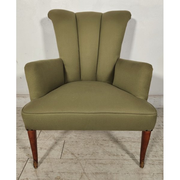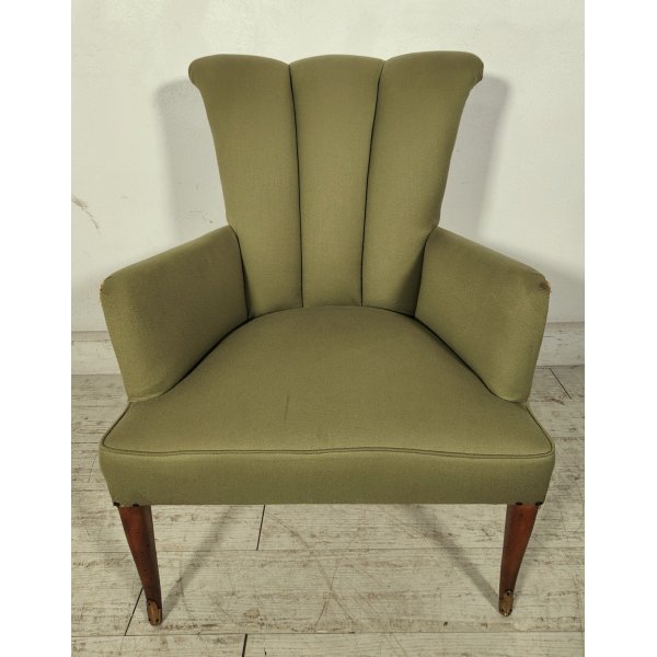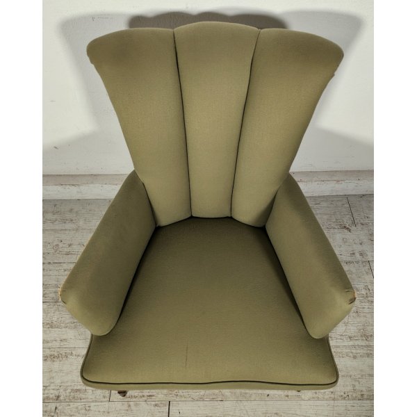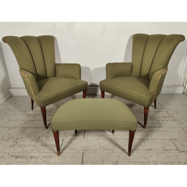 Delizioso salotto d'epoca color verde oliva, composto da 2 poltroncine con braccioli e schienale a conchiglia ed 1 pouf con sagoma a fagiolo, tutto rivestito in stoffa da cui spuntano solo le gambe a sciabola con terminali in ottone
