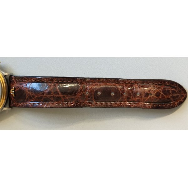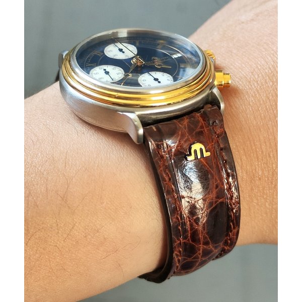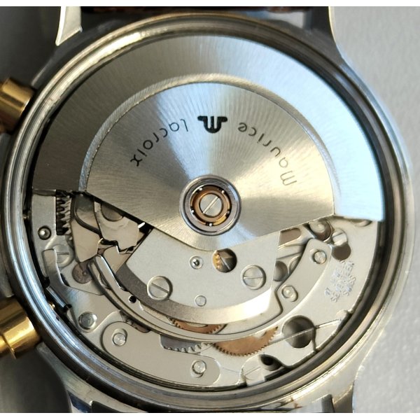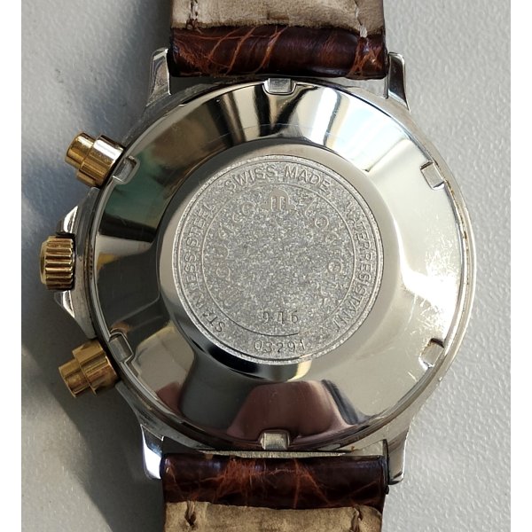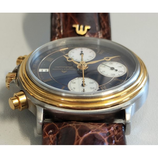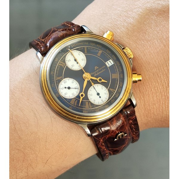 Splendido e prezioso orologio da polso vintage, Maurice Lacroix Masterpiece, cinturino in pelle originale riportante logo Maurice Lacroix "M" e con fibbia color oro, cassa in acciaio e oro, quadrante color blu con contatori cronografo color madreperla ed indicatore data alle ore 3, movimento automatico perfettamente funzionante