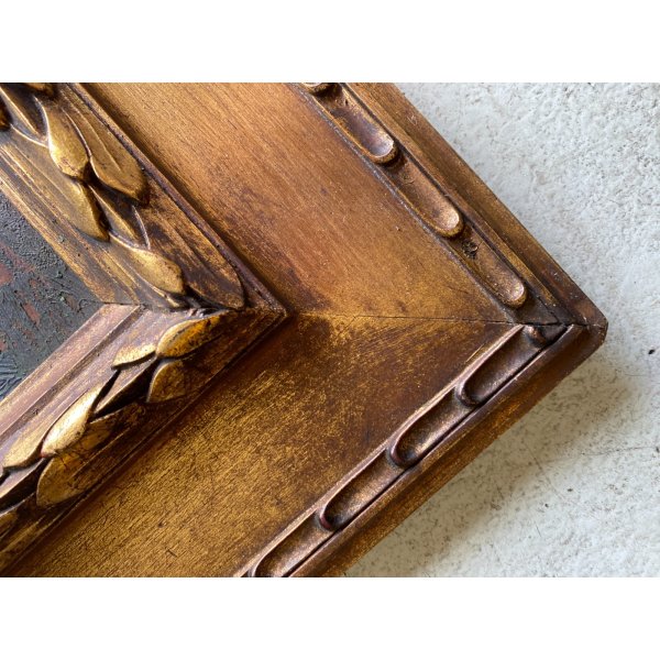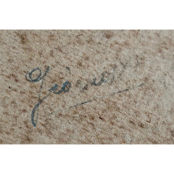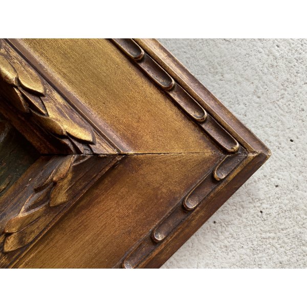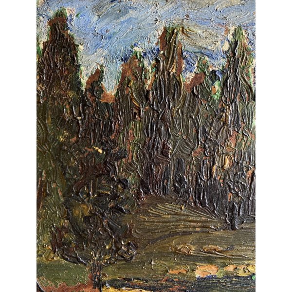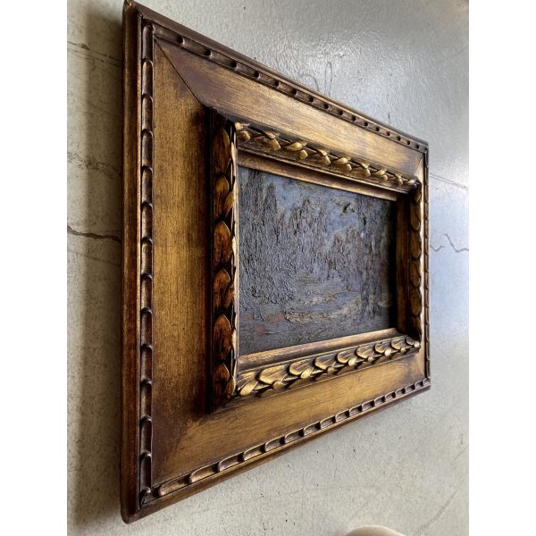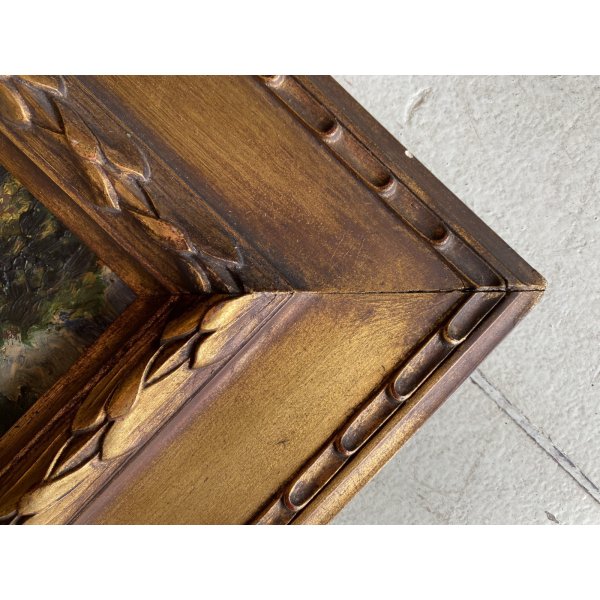 Antico dipinto olio su tavoletta, opera firmata al verso ma di difficile interpretazione, rappresentante un paesaggio boschivo con un cielo nuvoloso. Dipinto caratterizzato da pennellate materiche e toni scuri terrosi con una resa suggestiva della luce, tipiche della pittura di paesaggio di fine '800. L' opera presenta segni del tempo e di usura, mancanze di film pittorico, è contenuta in una cornice in legno dorato, ornato con decorazioni fogliate e scanalate che ne esaltano la presentazione. Tutto visibile dalle fotografie allegate all'inserzione