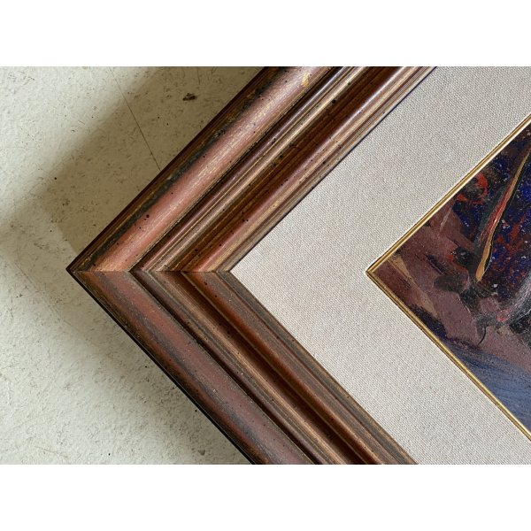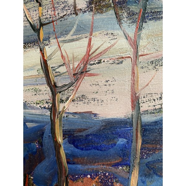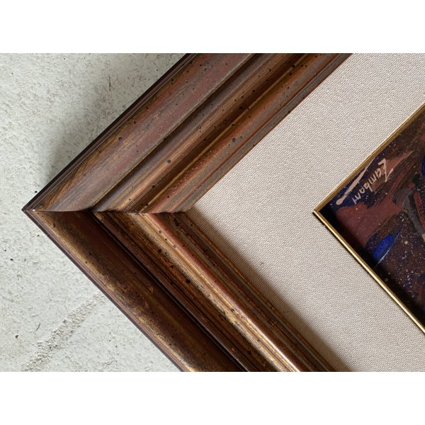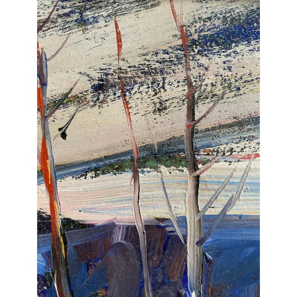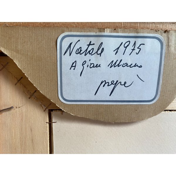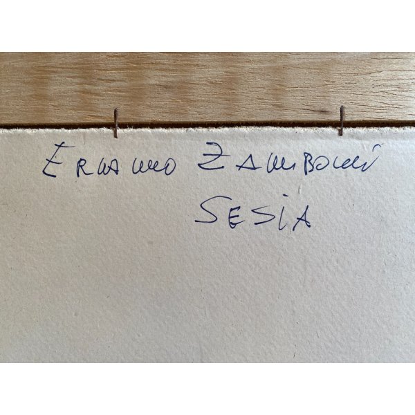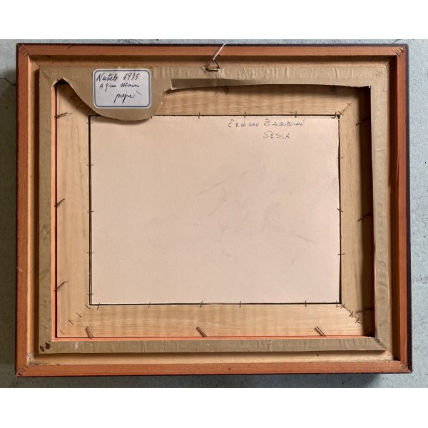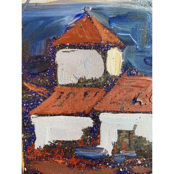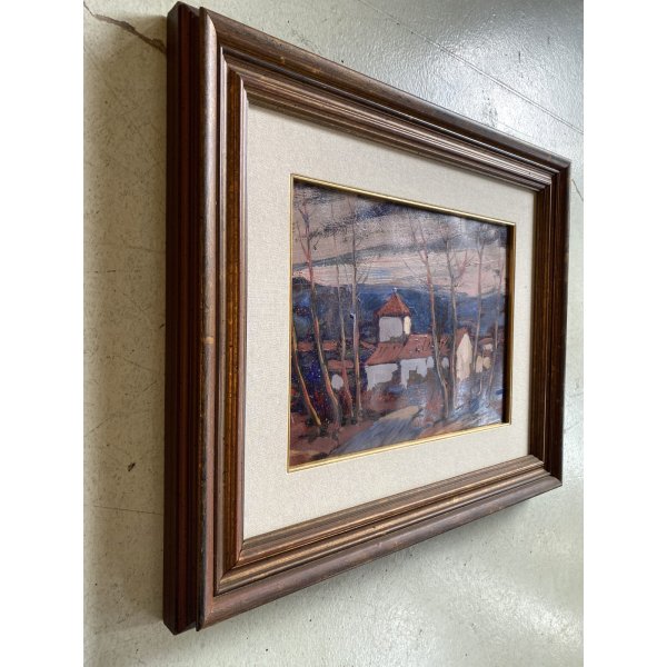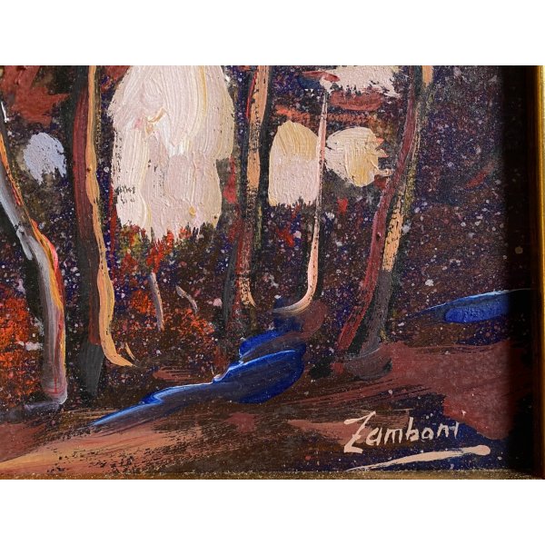 Suggestivo dipinto ad olio su cartone, firmato in basso a destra "Zamboni", artista nato nel 1932, quotato e presente in asta, attivo negli anni '60/'70 nel territorio di Borgosesia. Opera rappresentante un paesaggio rurale, autunnale, nell'ora del tramonto. Le pennellate sono visibili, i colori sono intensi, non sempre fedeli alla realtà, si tratta di un' interpreatazione emotiva del paesaggio, i tronchi degli alberi hanno sfumature rosse e arancioni, i colori drammatici del cielo creano un forte contrasto con il blu profondo del paesaggio e il bianco luminoso delle case. L' opera è in buone condizioni conservative, contenuta in una cornice lignea con passepartout in tela grezza. Sul retro è presente il nome dell'artista e la località rappresentata: "Ermanno Zamboni" "Sesia" e un'etichetta con una dedica datata "Natale 1975 a..."