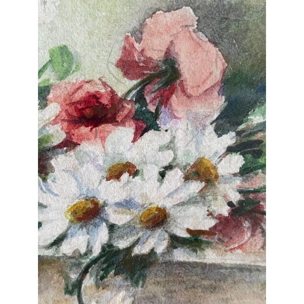 Stupendo e suggestivo acquerello, rappresentante un bouquet fiorito con rose, margherite e geranei che pendono da un vaso in pietra disegnato a matita, volutamente abbozzato, opera di ottima fattura dallo stile morbido e delicato, firmata con un il monogramma "AB". Acquerello contenuto in una cornice ì dorata con passepartout ligneo e vetro protettivo.