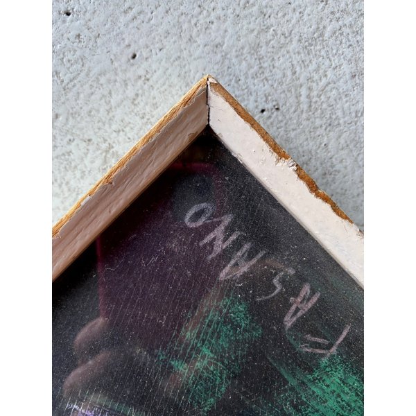 Stupendo dipinto olio su cartone, dipinto con tecnica mista, opera di Fasano Orlando (1915-2001) firmato in basso a destra "Fasano", al verso presenta un cartiglio e il timbro della Galleria Schettini di Milano. Opera contenuta in una cornice lignea minimale laccata color bianco, con evidente usura, completa di vetro protettivo