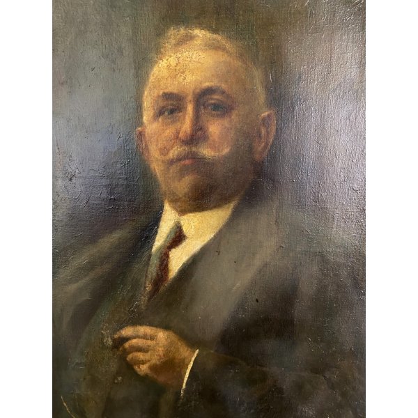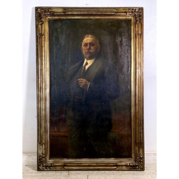 Stupendo grande dipinto olio su tela (101x153cm) firmato in basso a sinistra "Ivan Karpof" rappresentante il ritratto di un nobiluomo a figura intera, su sfondo scuro, vestito in abiti scuri con un'eleganza raffinata che riflette la moda del'epoca del primo '900. L'uomo si presenta con un portamento fiero e dignitoso, e uno sguardo deciso. I grandi baffi ben curati incorniciano il volto, tra le dita tiene con sicurezza un sigaro, simbolo di prestigio e carattere. La composizione esalta la presenza imponente del soggetto, con dettagli accurati nel vestiario e nelle espressioni, creando un'immagine di forte impatto e di grande eleganza. L' opera presenta segni di restauro pregressi, ritocchi e punti mancanti di film pittorico, piccoli fori, tutto visibile dalle fotografie allegate all'inserzione. Dipinto contenuto in una cornice lignea coeva, ornata, e dorata intagliata