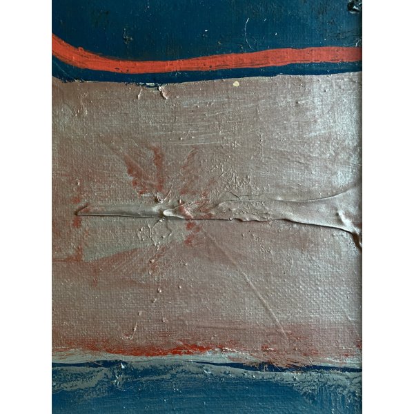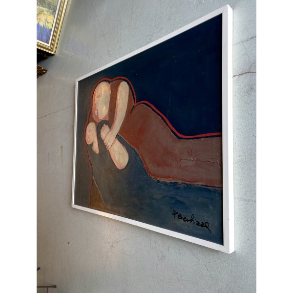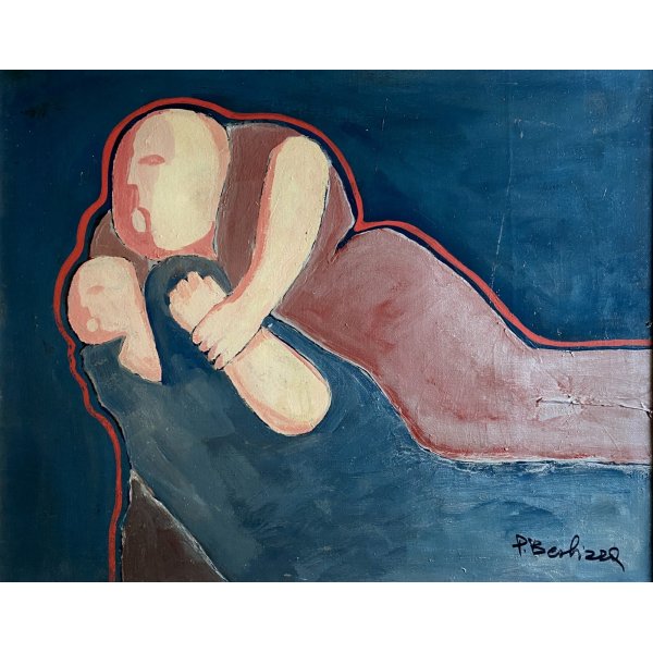 Stupendo grande dipinto astratto olio su tela (104 x 84 cm), firmato in basso a destra, leggibile con difficoltà come “P. Berhizza” (o simile). Composizione rappresentante due figure sdraiate, accovacciate, la cui postura di una, sembra trattenere o contenere il polso dell’altra. Il loro profilo è rivolto oltre la cornice, si perde in uno spazio indefinito. Un contorno rosso delineante, segue e avvolge le figure, separandole dallo sfondo scuro, dai toni grigio e blu e contribuisce a esaltare la loro forma. Il tutto è contenuto in una cornice lignea minimale, laccata di bianco, che ne enfatizza l’eleganza.