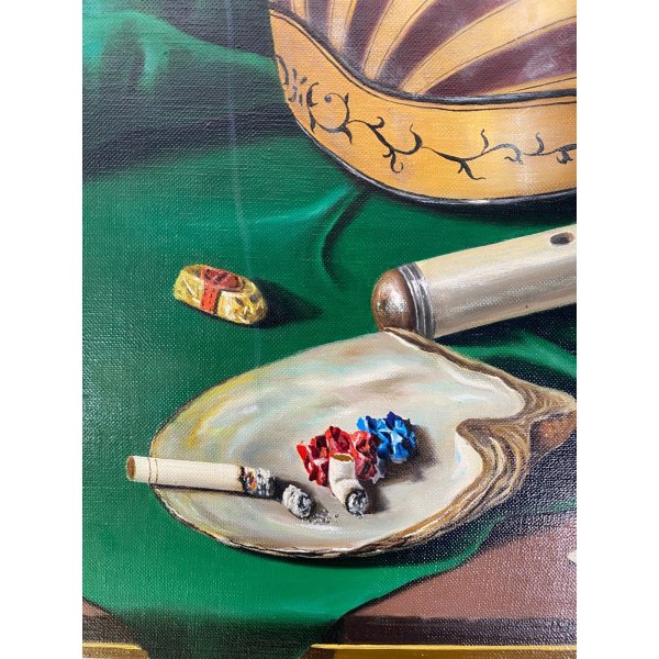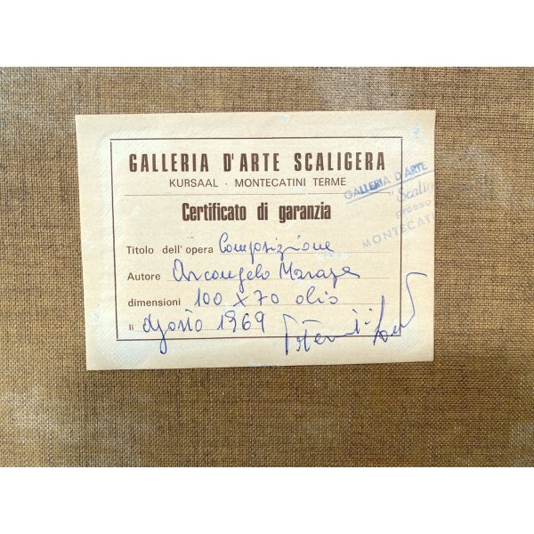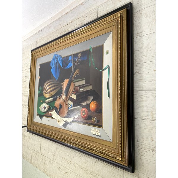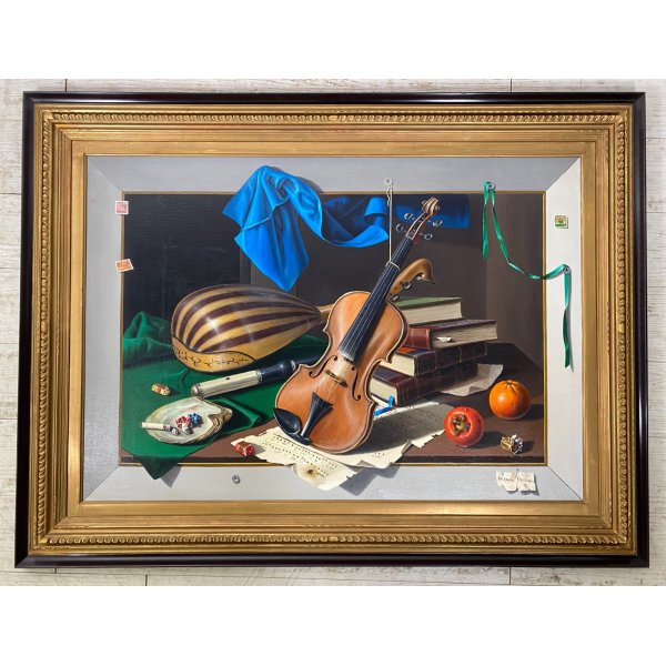 Incantevole dipinto ad olio su tela, opera di Arcangelo Maraga (1925-2007) artista surrealista figurativo, quotao e presente in asta. Dipinto raffigurante una natura morta con strumenti musicali, spartiti, libri e frutta. Una sospensione metafisica di oggettiche esprimono il sentimento dell'animo dell'artista, resi con grande realismo. Dipinto firmato in basso a destra su foglietto puntato da uno spillo, presenta un'etichetta al verso: Galleria d'Arte Scaligera, Montecatine Terme. Contenuto in una doppia cornice, color mogano lineare, sormontata da una cornice ornata dorata.