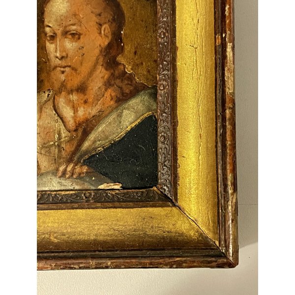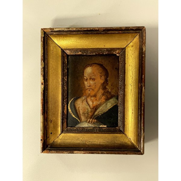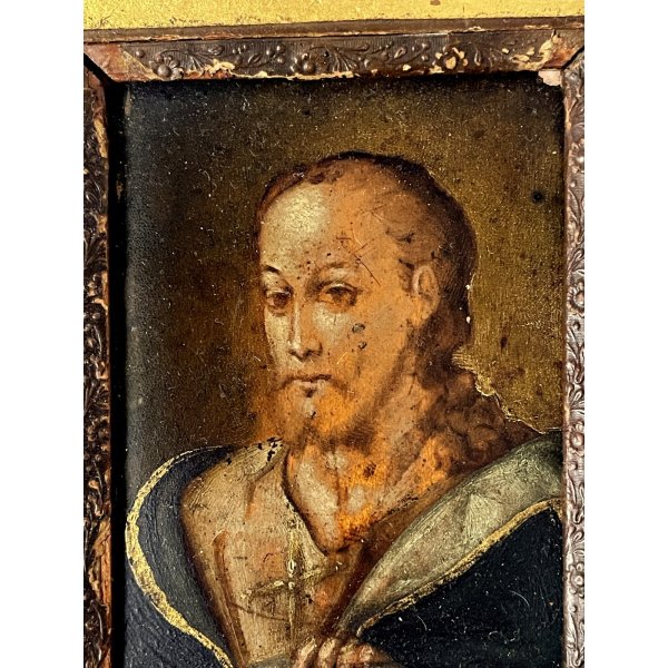 Bellissima antica miniatura con dipinto su rame. Dalla veste potrebbe rappresentare un uomo dell'Ordine dei Cavalieri di San Giorgio o lo stesso Santo. Il ramino si può datare del '600, cornice e retro non coevi.